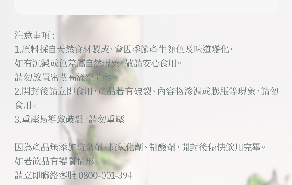1.原料採自天然食材製成,會因季節產生顏色及味道變化,如有沉澱或色差屬自然現象,敬請安心食用。請勿放置密閉高溫空間內。