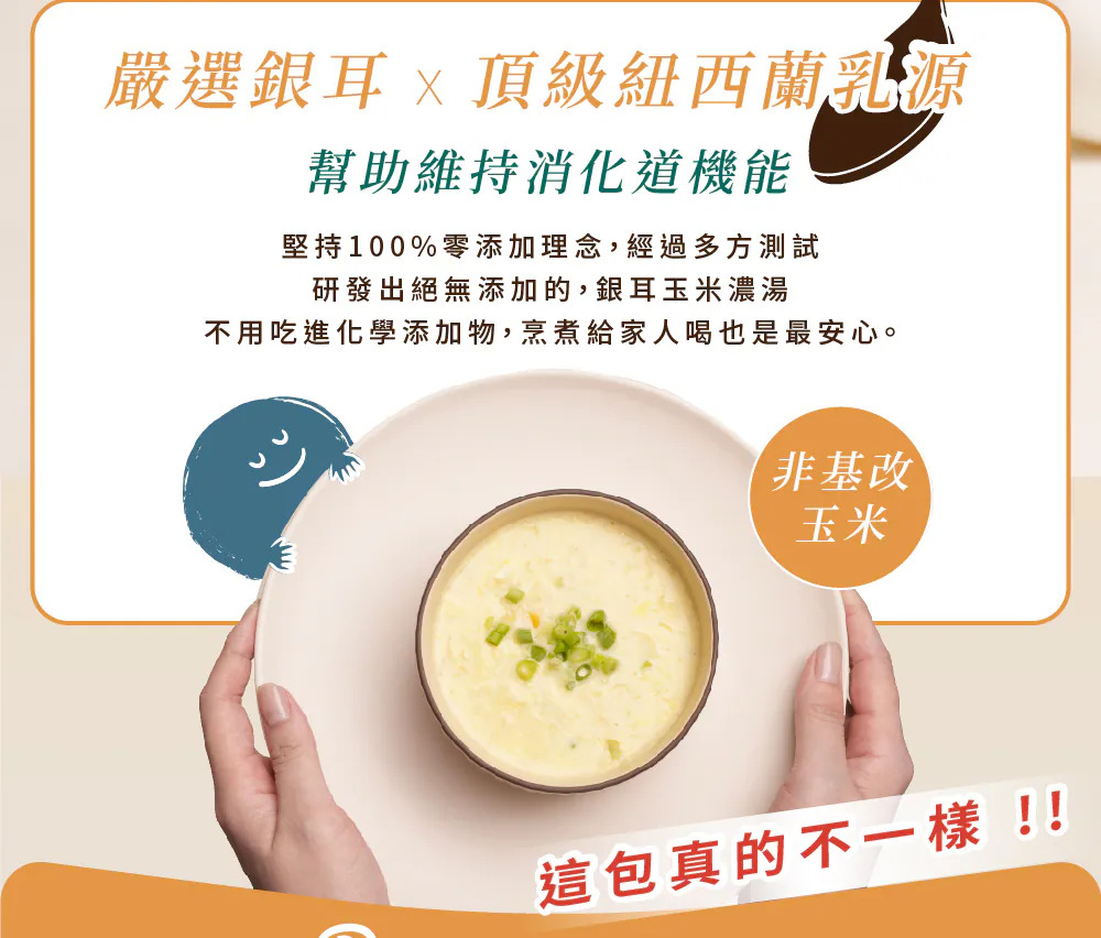 這包真的不一樣,絕無添加化學添加物❌增稠劑❌抗凝結劑❌香精🏅頂級紐西蘭乳源,乳香濃郁🏅嚴選銀耳配方,幫助維持消化道機能🏅嚴選非基改玉米🏅無添加抗結塊劑,100%零添加,給家人最安心的喝護堅持100%零添加理念,經過多方測試研發出絕無添加的,銀耳玉米濃湯不用吃進化學添加物,烹煮給家人喝也是最安心。【沖泡粉包,一鍋健康湯品即刻上桌 !】