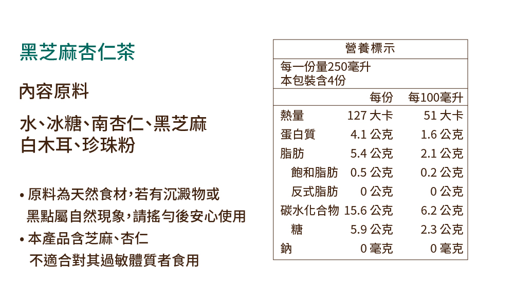-珍珠杏仁美妍茶- 每一份量250毫升,本包裝含4份 -每份- 熱量:150大卡 蛋白質:19.3公克 脂肪:3.8公克 飽和脂肪:0.3公克 反式脂肪:0公克 碳水化合物:10公克 糖:8.8公克 鈉:8毫克 -每100毫升- 熱量:60大卡 蛋白質:7.7公克 脂肪:1.5公克 飽和脂肪:0.1公克 反式脂肪:0公克 碳水化合物:4公克 糖:3.5公克 鈉:3毫克 -黑芝麻杏仁茶- 每一份量250毫升,本包裝含4份 -每份- 熱量:127大卡 蛋白質:4.1公克 脂肪:5.4公克 飽和脂肪:0.5公克 反式脂肪:0公克 碳水化合物:15.6公克 糖:5.9公克 鈉:0毫克 -每100毫升- 熱量:51大卡 蛋白質:1.6公克 脂肪:2.1公克 飽和脂肪:0.2公克 反式脂肪:0公克 碳水化合物:6.2公克 糖:2.3公克 鈉:0毫克