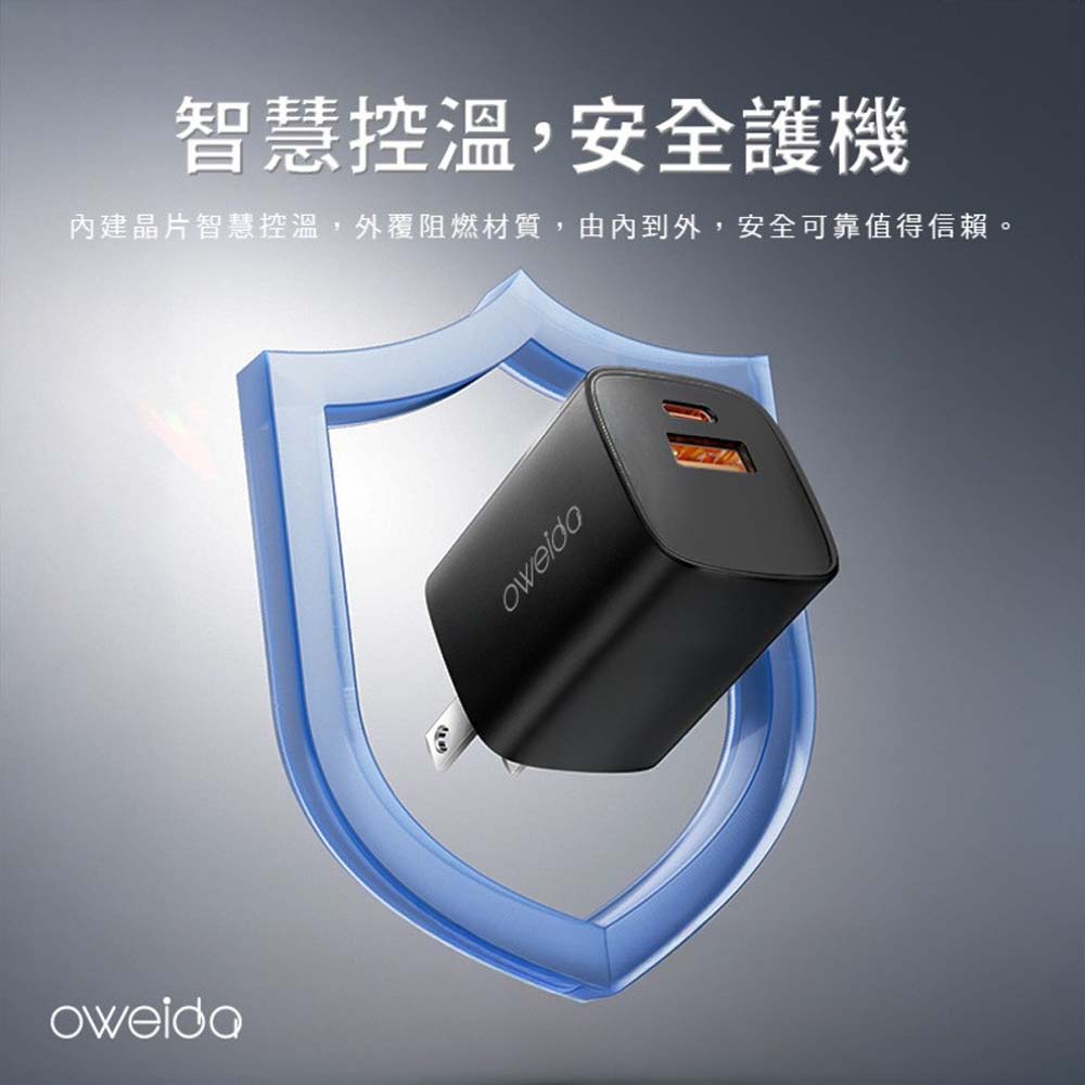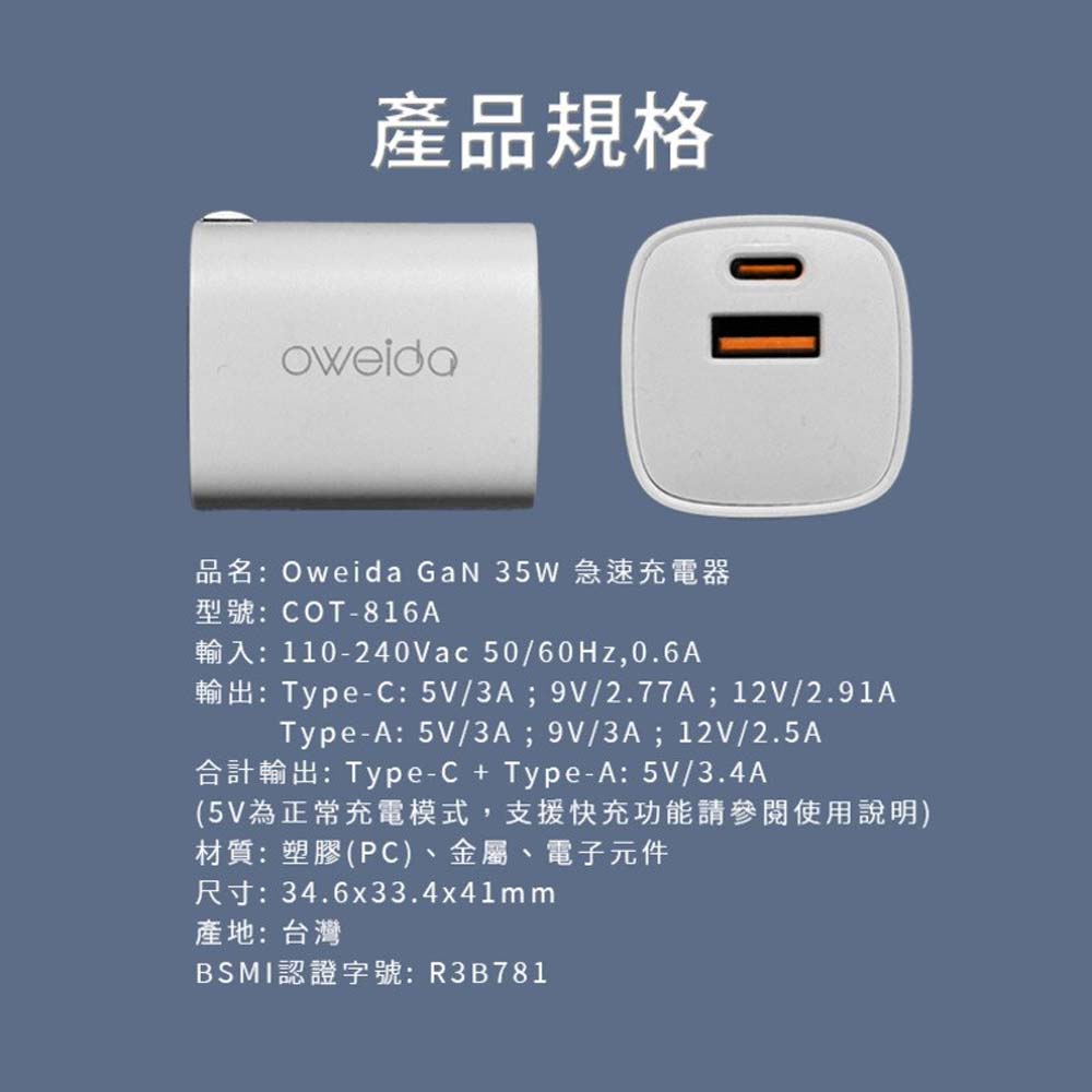 【商品規格】品名: Oweida GaN 35W 急速充電器型號: COT-816A輸入: 110-240Vac 50/60Hz,0.6A輸出: Type-C: 5V/3A ; 9V/2.77A ; 12V/2.91AType-A: 5V/3A ; 9V/3A ; 12V/2.5A合計輸出: Type-C + Type-A: 5V/3.4A(5V為正常充電模式,支援快充功能請參閱使用說明)材質: 塑膠(PC)、金屬、電子元件尺寸: 34.6×33.4x41mm