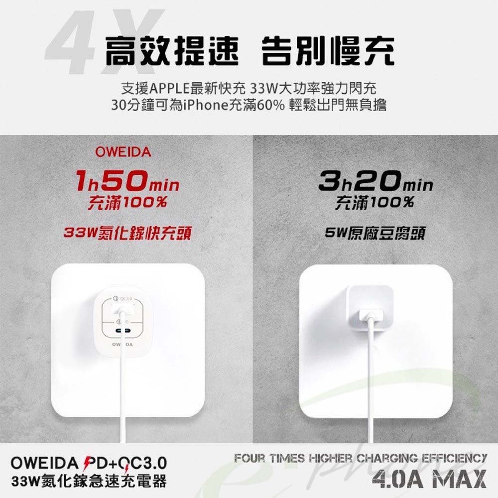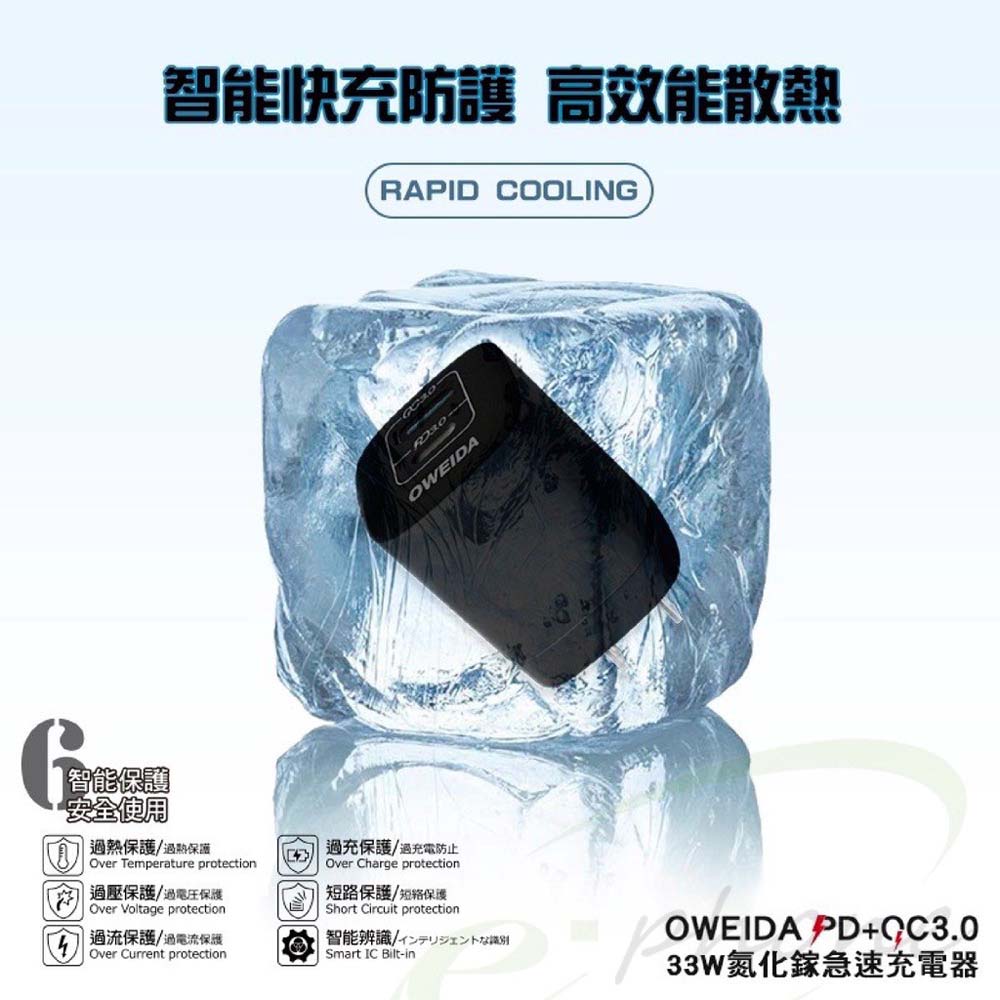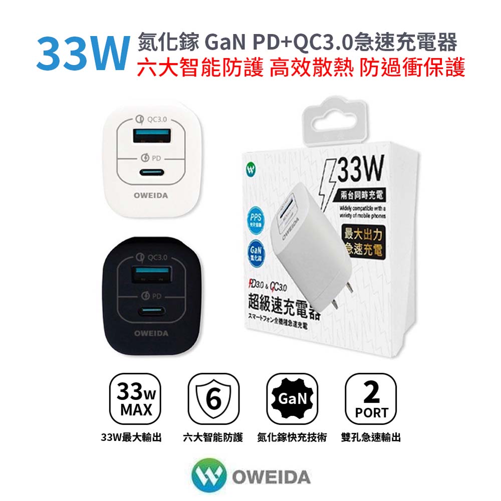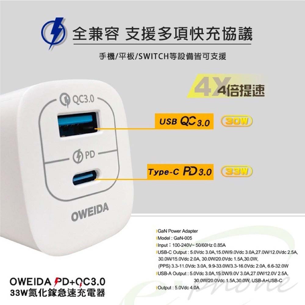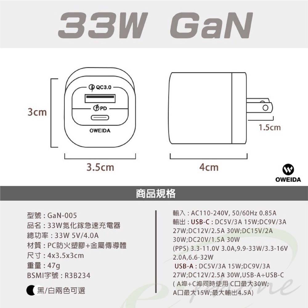 • 防火材質採用+摺疊設計 攜帶安全方便【商品規格】型號:GaN-005品名:33W氮化鎵急速充電器總功率:33W 5V/4.0A重量:47g輸入: AC110-240V, 50/60Hz 0.85A輸出:USB-C : DC5V/3A 15W;DC9V/3A 27W;DC12V/2.5A 30W;DC15V/2A 30W;DC20V/1.5A 30W(PPS) 3.3-11.0V 3.0A,9.9-33W/3.3-16V 2.0A,6.6-32WUSB-A : DC5V/3A 15W;DC9V/3A 27W;DC12V/2.5A 30W,USB-A+USB-C( A埠+C埠同時使用 C口最大30W;A口最大15W;最大輸出4.5A)