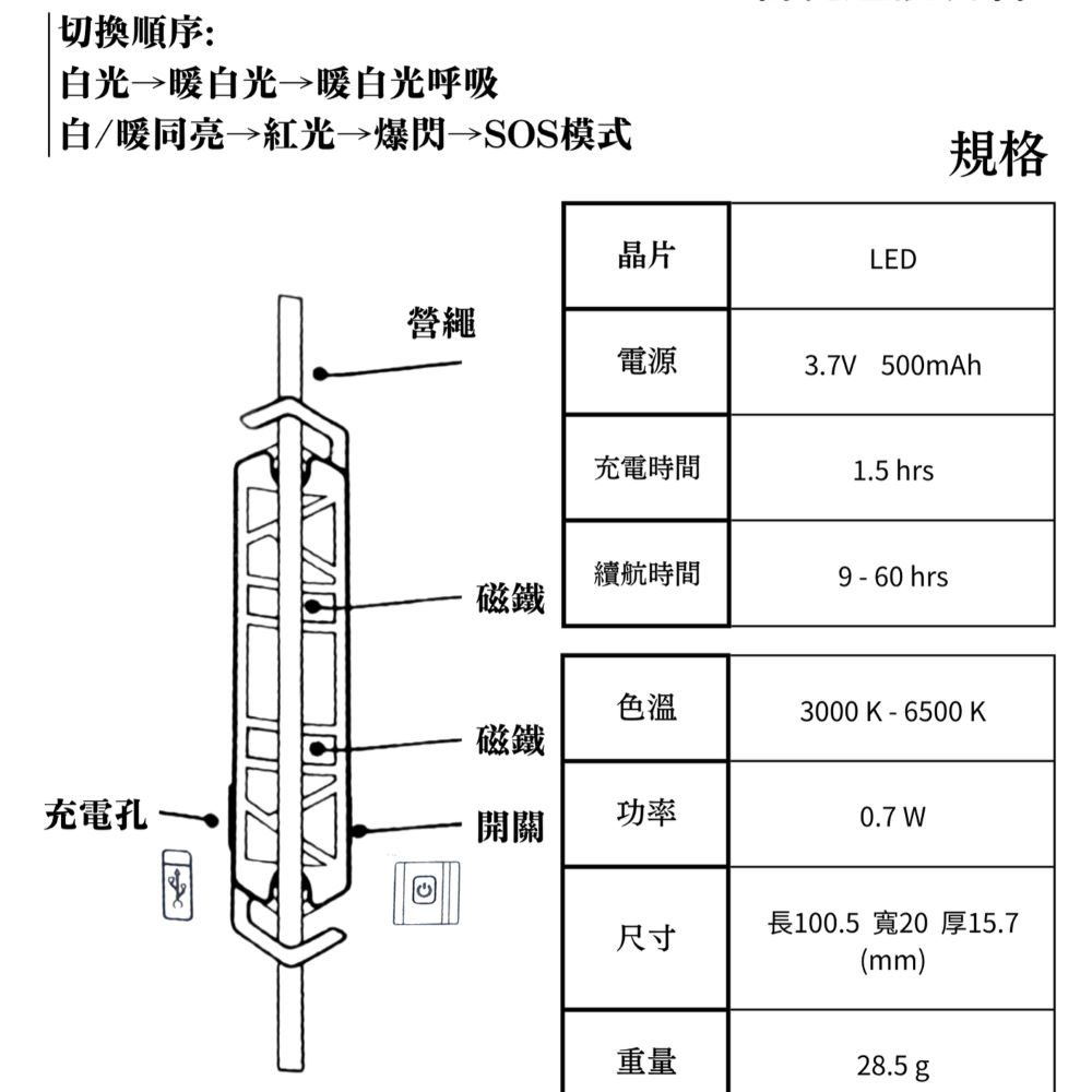 【HYUGA】營繩警示燈 磁吸功能 七種燈光模式 Type-c充電