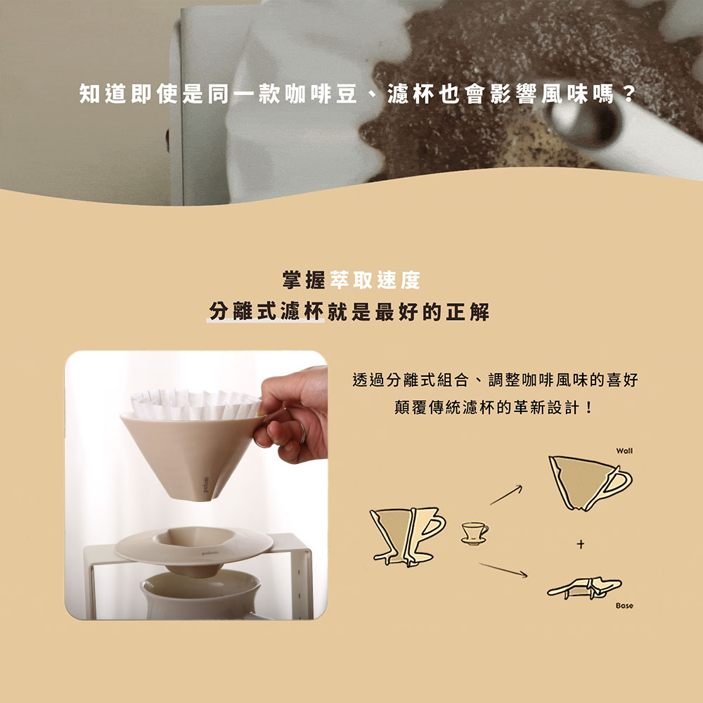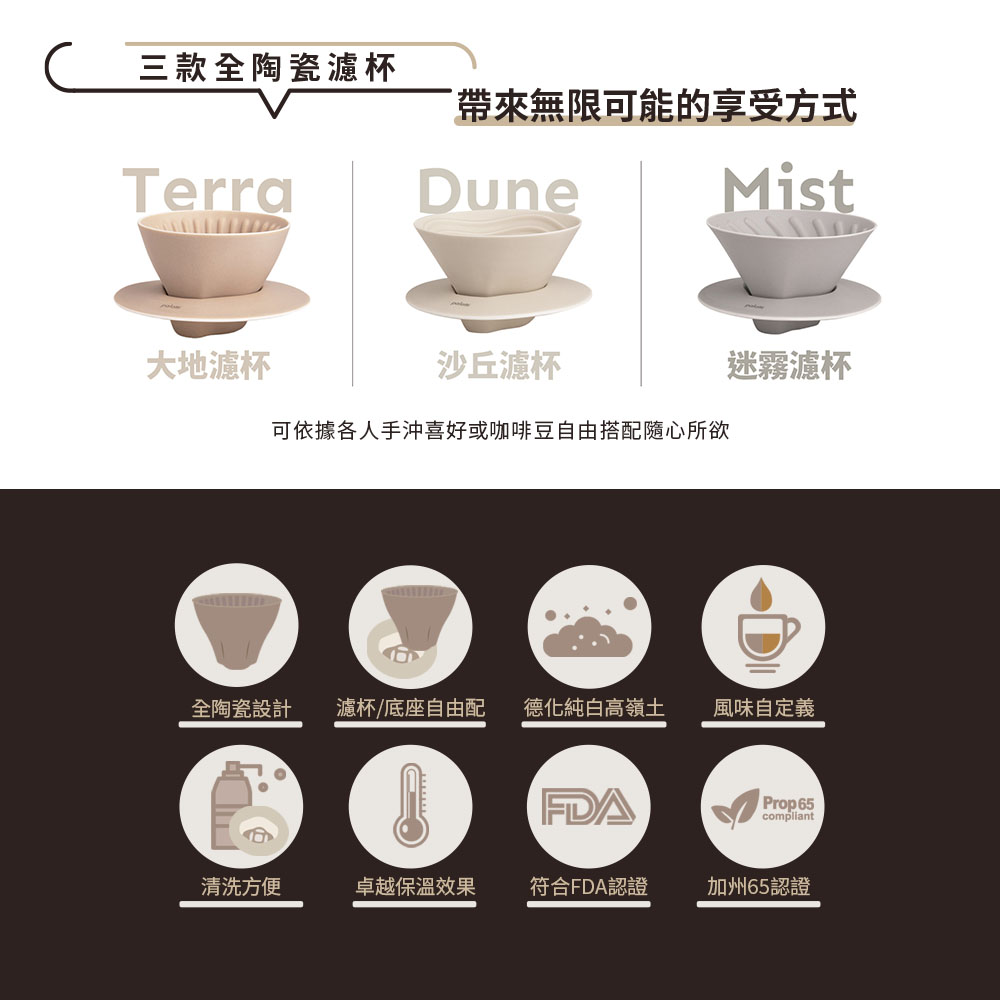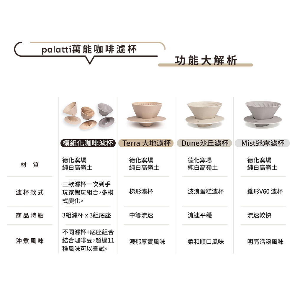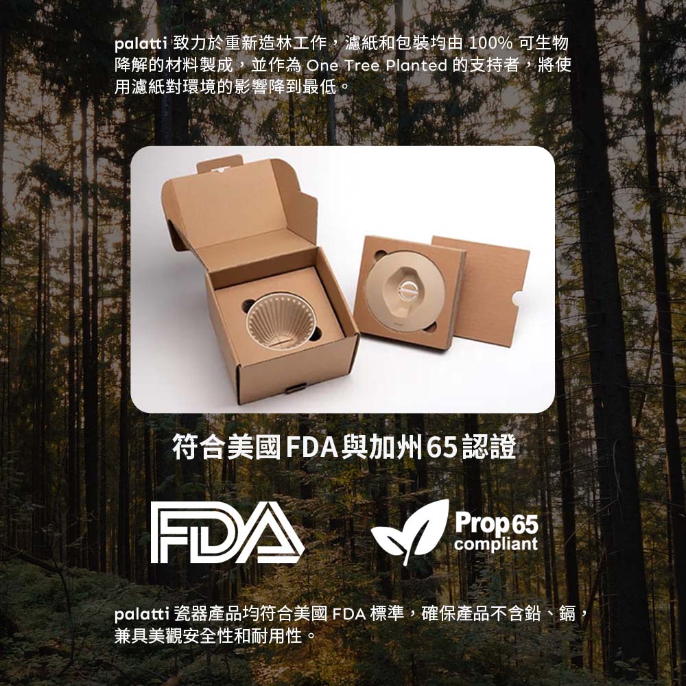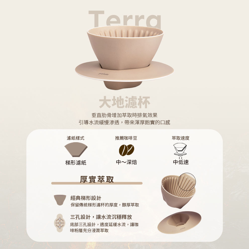 【palatti】Terra大地濾杯,採用德化瓷製成,在 1300°C 的高溫下燒製,不含鉛、不含鎘,可用洗碗機清洗,並符美國FDA 和 加州65提案的標準。垂直延展的肋骨結構,如大地脈絡般穩定搭配一字形排水濾杯,及特殊三孔底座設計,使咖啡粉層充分浸潤,以較慢的流速帶來濃郁的風味。3孔梯形設計確保咖啡床更高、流速中慢、萃取均勻,從而獲得醇厚美味的咖啡,palatti咖啡濾杯為專利模組化設計,可互換其他款palatti濾杯及底座,進行多種不同沖煮變化。