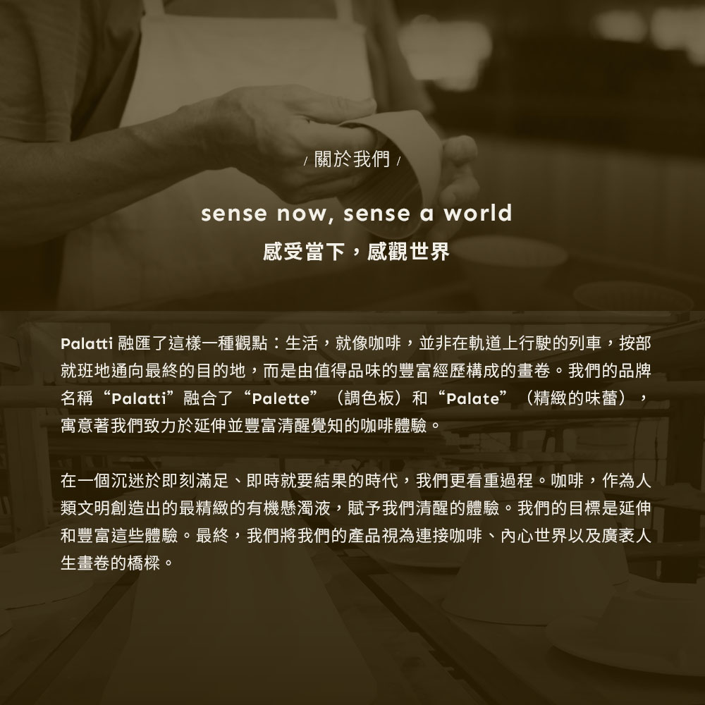 我們的品牌名稱「palatti」融合了「調色板(palette)」與「味覺(palate)」的概念,象徵著我們拓展並豐富與咖啡相伴的日常體驗的使命!