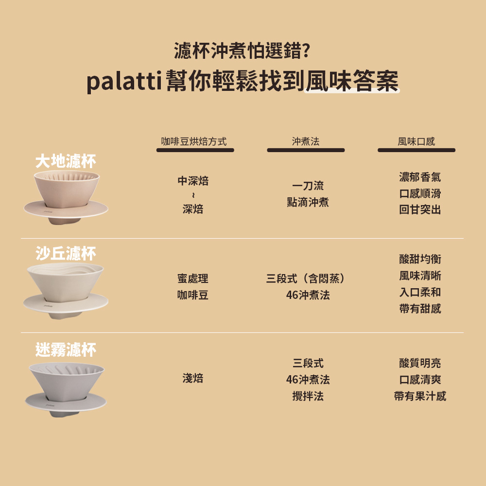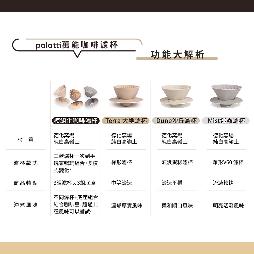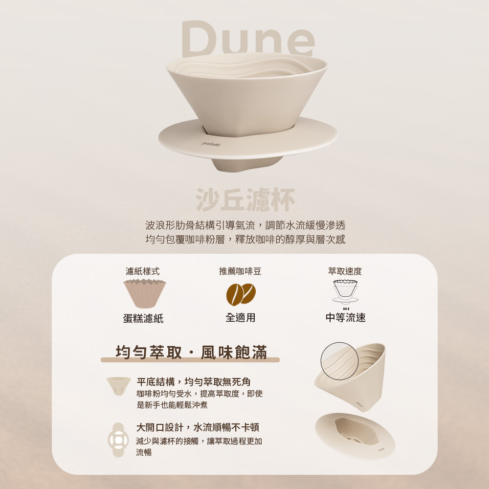 【palatti】Dune沙丘濾杯,採用德化瓷製成,在 1300°C 的高溫下燒製而成,不含鉛、不含鎘,可用洗碗機清洗,並符美國FDA 和 加州65提案的標準。平底有5個大孔和波浪肋條,波浪狀肋條設計,調節水流均勻萃取包覆粉層,確保每次都能均勻萃取、中等流量和均衡、細膩的口感,即使是新手也能輕鬆沖煮,享受風味飽滿的咖啡體驗,palatti咖啡濾杯為專利模組化設計,可互換其他款palatti濾杯及底座,進行多種不同沖煮變化。