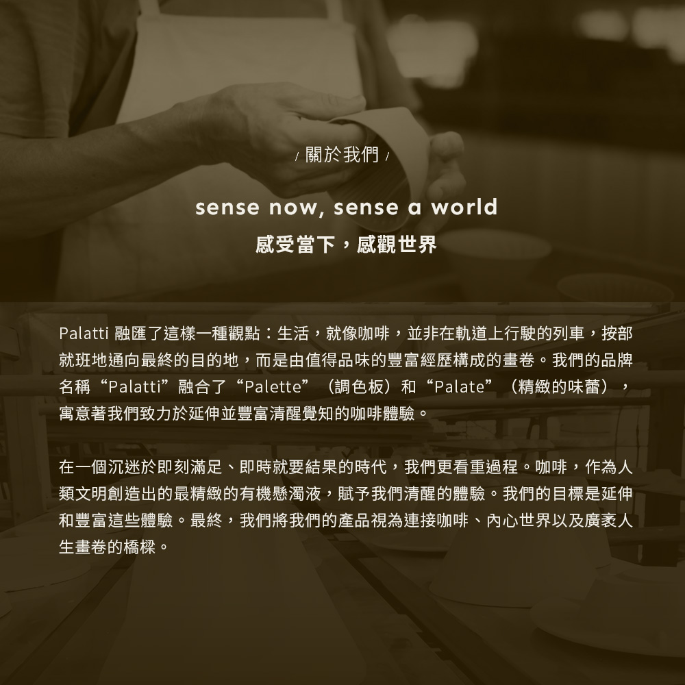 我們的品牌名稱「palatti」融合了「調色板(palette)」與「味覺(palate)」的概念,象徵著我們拓展並豐富與咖啡相伴的日常體驗的使命!