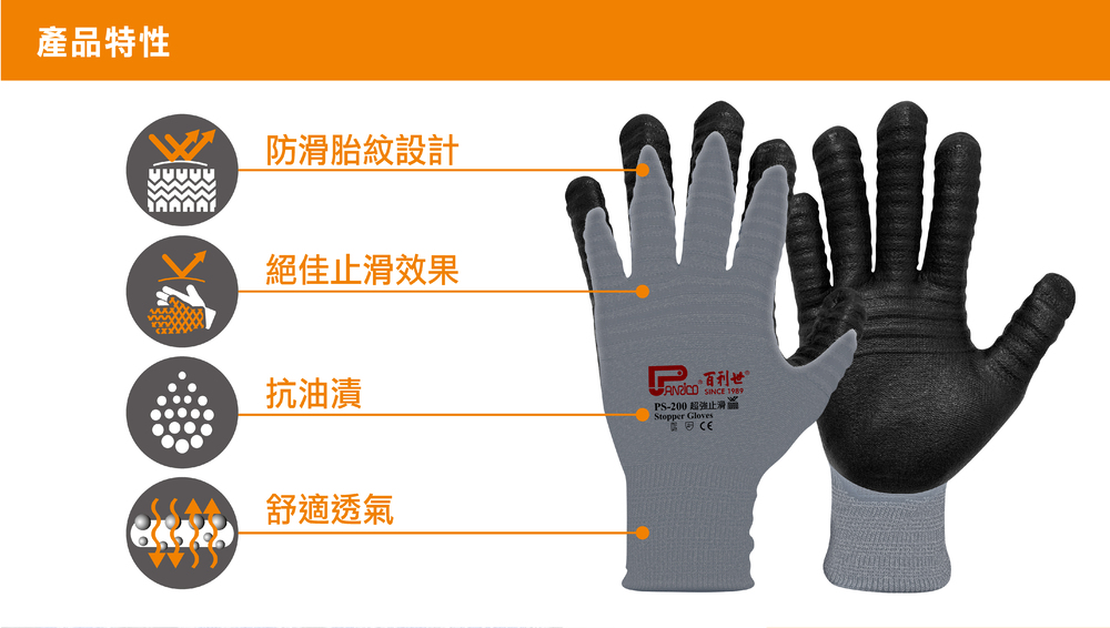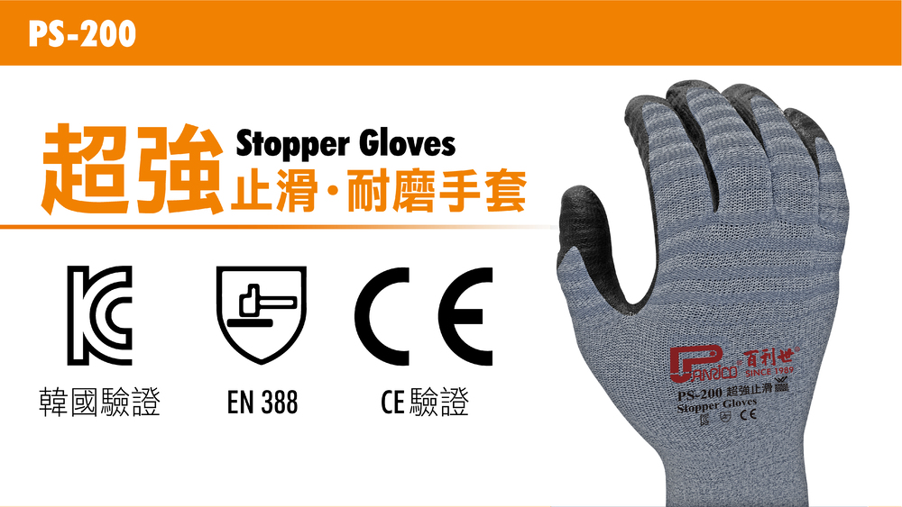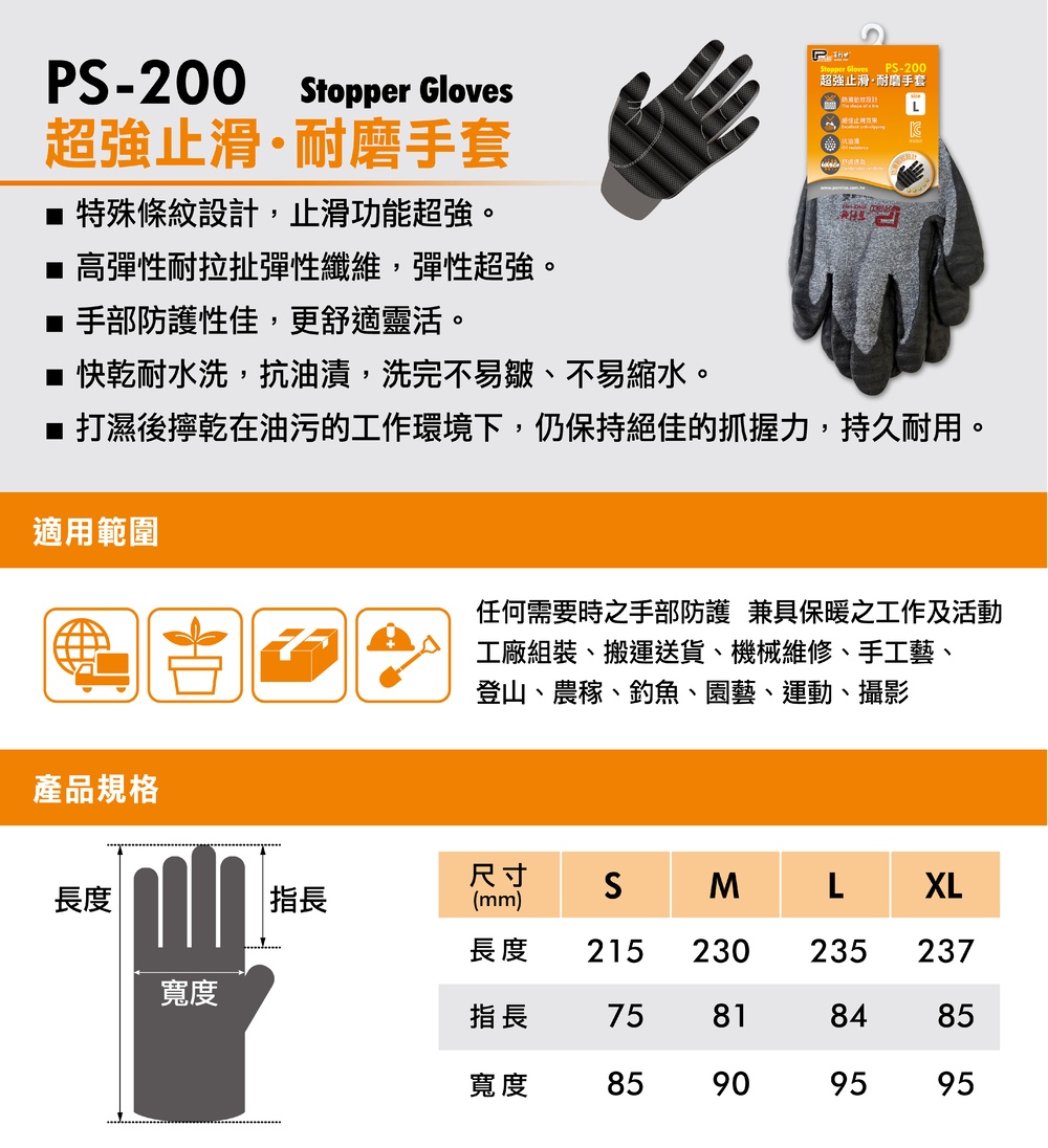 韓國製造PS-200超強止滑耐磨手套,是加強防滑工作手套,透氣性佳,具有絕佳的止滑防滑效果。抗油漬、耐磨、耐拉址,抓握力強。PS-200超強止滑耐磨手套能於任何需要止滑及保護手部之工作場合中使用,特別是管道工作、倉儲人員、施工人員、貨運人員、冷凍空調施工及需在耐油環境底下使用手工具做維修之工作等,另戶外騎車、園藝、手工藝、漁業捕撈、軍事生存、登山溯溪等均可使用。