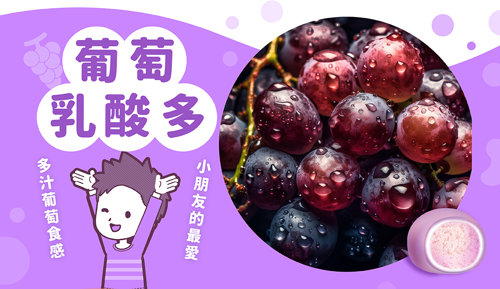 葡萄乳酸多_砂糖、麥芽糖、椰子油、明膠、果寡醣、奶粉、煉乳、葡萄濃縮果汁、檸檬酸(調味劑)、維生素C (抗氧化劑)、香料、脂肪酸蔗糖酯 (乳化劑)、天然食用色素(花青素)、芽孢乳酸菌、棕櫚蠟 (食品製造用劑)。
