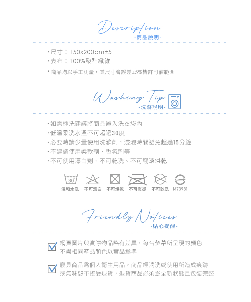 ·尺寸:150x200cm±5·表布:100%聚酯纖維·商品均以手工測量,其尺寸會誤差±5%皆許可值範圍·商檢局檢驗字號:M73981·清潔方式:可水洗(水溫不超過攝氏30度)/不可乾洗/不可烘乾/不可漂白/不可熨燙·請使用大型洗衣袋清洗,可保持色澤鮮明,更不易造成勾紗等現象※網頁圖片僅為示意圖參考,不含拍攝道具,實際出貨件數以「商品內容」說明為主※因拍攝關係或螢幕色差,網頁圖片與實品略有差異,產品圖僅供參考