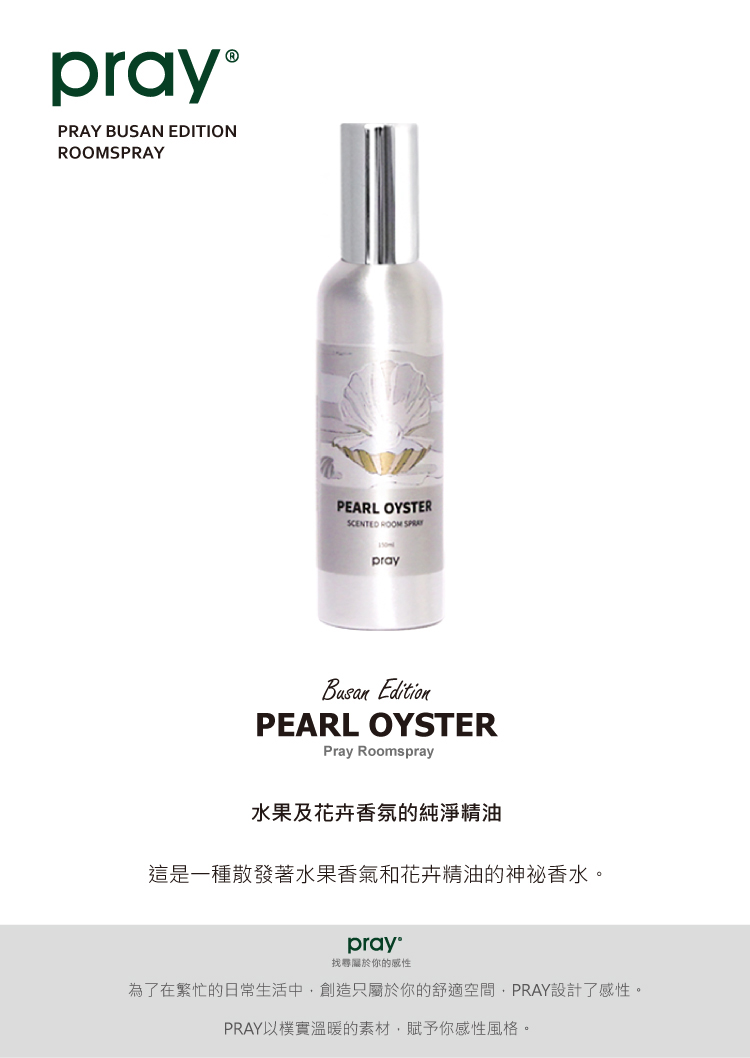 規格說明品名:PRAY韓國室內香氛噴霧釜山限定-白色眼淚成分:香料、乙醇、純水容量:150 ml尺寸:4.5 x 17 cm用途:除臭、空氣清新檢驗號碼:SGS: UG/2020/70352製造國:韓國■注意事項1. 請勿用於其他目的2. 存放在兒童與寵物接觸不到地方3. 若內容物接觸到眼睛,請用水清洗4. 使用時如果皮膚出現異常,請諮詢醫生5. 避免噴在絲綢、人造絲、麻、羊毛或皮革等不耐水的紡織品,衣物可能會引起污漬或收縮6. 請勿存放在高溫、陽光直射的場域