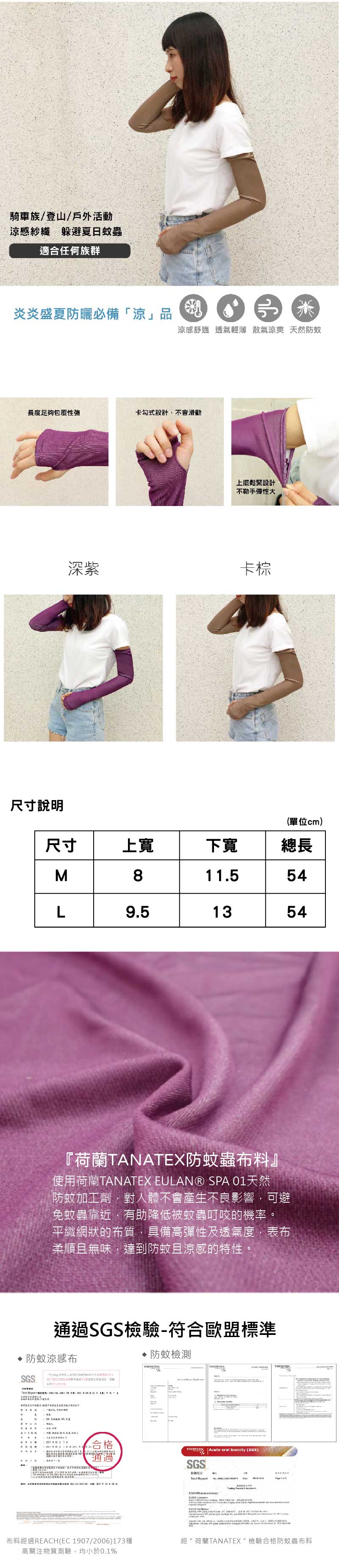 ▲經"荷蘭TANATEX"檢驗合格防蚊蟲布料,高效防護蚊蟲叮咬,無味、無刺激、耐水洗、對人體無害可安心使用▲吸濕排汗,舒適輕薄感、輕巧方便收納,不易有皺褶感▲具備高彈性及透氣度佳▲布料經SGS歐盟認證標準▲機車族、爬山、戶外運動、愛美白怕曬黑等皆適用【尺寸/重量】(M)上寬8*下寬11.5*總長54(±1cm)/33g(±10g)(L)上寬9.5*下寬13*總長54(±1cm)/38g(±10g)【材質】聚酯纖維50%、尼龍50% 【注意事項】① 產品顏色因每台電腦螢幕的不同,請依實際顏色為主② 正常使用情況下布套建議定期清洗或擦拭,並且深淺色分開來洗滌③ 請避免潮濕 / 浸水 / 火源 / 利刃 / 高溫 / 日曬④ 請勿堆壓重物 / 避免不當拉扯或擠壓 / 避免沾染化學藥劑或揮發性溶劑