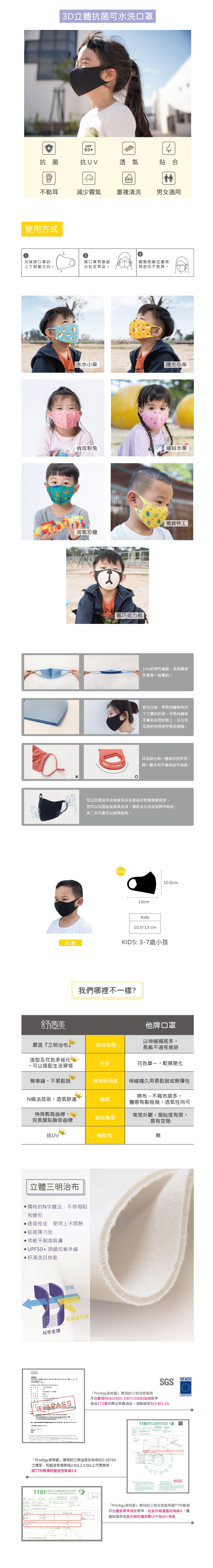 "不再只是一層保護 走上流行穿搭更加分"▲3D立體空氣布使其透氣,呼吸順暢不悶熱▲ 完全貼合臉部曲線,戴眼鏡時,減少霧氣▲一體成型無車縫,不使耳朵疼痛▲抗UV,抵擋紫外線侵害及抗菌認證【尺寸】13*10.5cm(±1cm)/4g(3-7歲)
