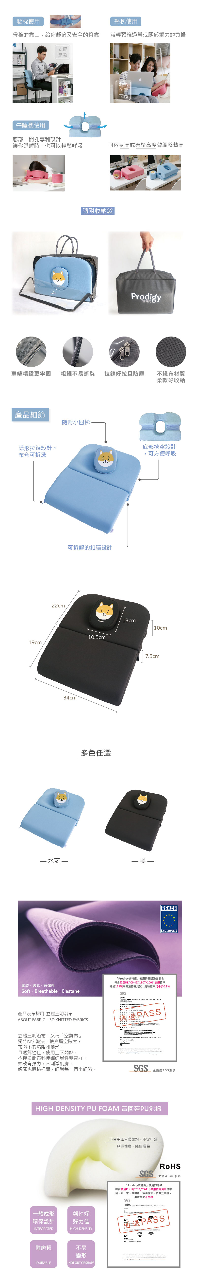 一次帶給你10大生活體驗,顛覆傳統午睡枕▲同時具備午休枕+腰枕+靠枕3合1用途▲三開孔專利設計,正趴也能呼吸順暢▲高密度彈力PU泡棉,軟硬適中且耐用期限長▲隨附小圓枕,正趴或側睡都能輕鬆使用▲嚴選優質三明治布作為表面層,高彈柔順,不易鬆垮▲布料通過SGS歐盟無毒標準,使用安心安全▲內附防塵收納袋,體積小攜帶方便【尺寸/重量】41*34*10cm(±1cm)/580g(±10g)【材質】聚酯纖維90%、彈性纖維10%、聚氨酯100%【產地】台灣【注意事項】① 產品顏色因每台電腦螢幕的不同,請依實際顏色為主② 正常使用情況下布套建議定期清洗或擦拭,並且深淺色分開來洗滌③ 請避免潮濕 / 浸水 / 火源 / 利刃 / 高溫 / 日曬④ 請勿堆壓重物 / 避免不當拉扯或擠壓 / 避免沾染化學藥劑或揮發性溶劑⑤ 枕芯正常使用下無須清洗,若有飲料等液體不慎流入可以清水沖洗後自然風乾即可,勿置於陽光下曝曬以免氧化影響使用壽命