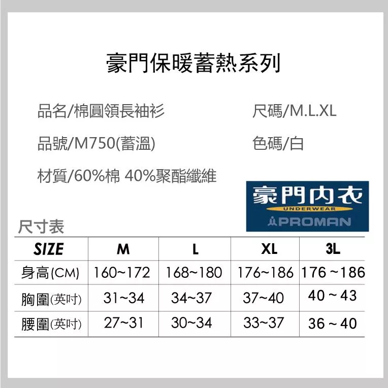 【PROMAN豪門】暖棉長袖圓領男保暖衛生衣M750
