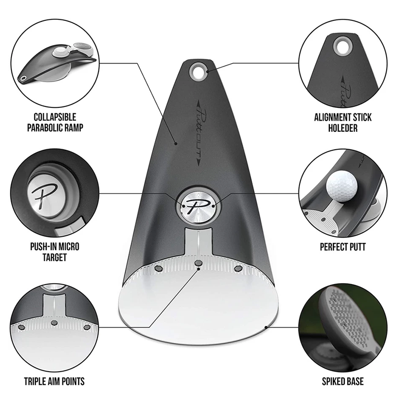 PuttOut 高爾夫 推桿訓練器 二代模擬果嶺上擊入真實球洞的確切條件|產品特色|・將原來的壓力推桿訓練器提升到另一個層次・三個較小的點靶可以讓玩家專注於並將其用作另一個常見的目標・全新清晰可見的標靶進行改良,帶來完美的推桿・在訓練器坡道頂部添加一個對齊桿支架