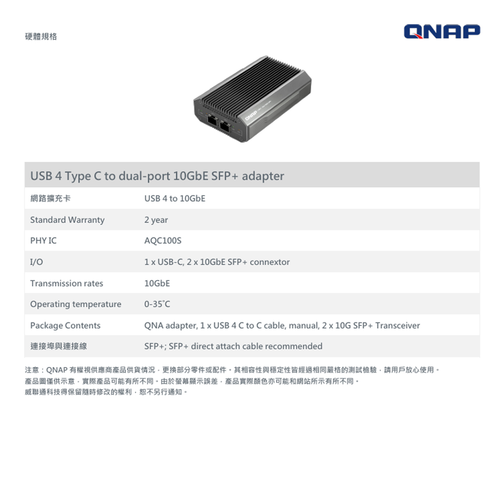 昌運監視器 QNAP 威聯通 QNA-UC10G2SF USB 4 Type-C轉10GbE SFP+ 雙埠網路轉換器