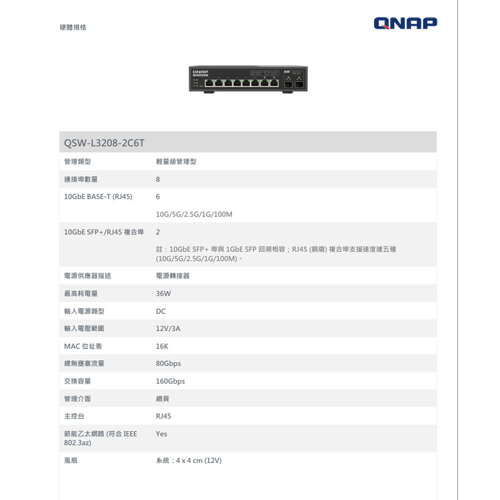 昌運監視器 QNAP 威聯通 QSW-L3208-2C6T 8埠 輕網管型交換器 網路交換器