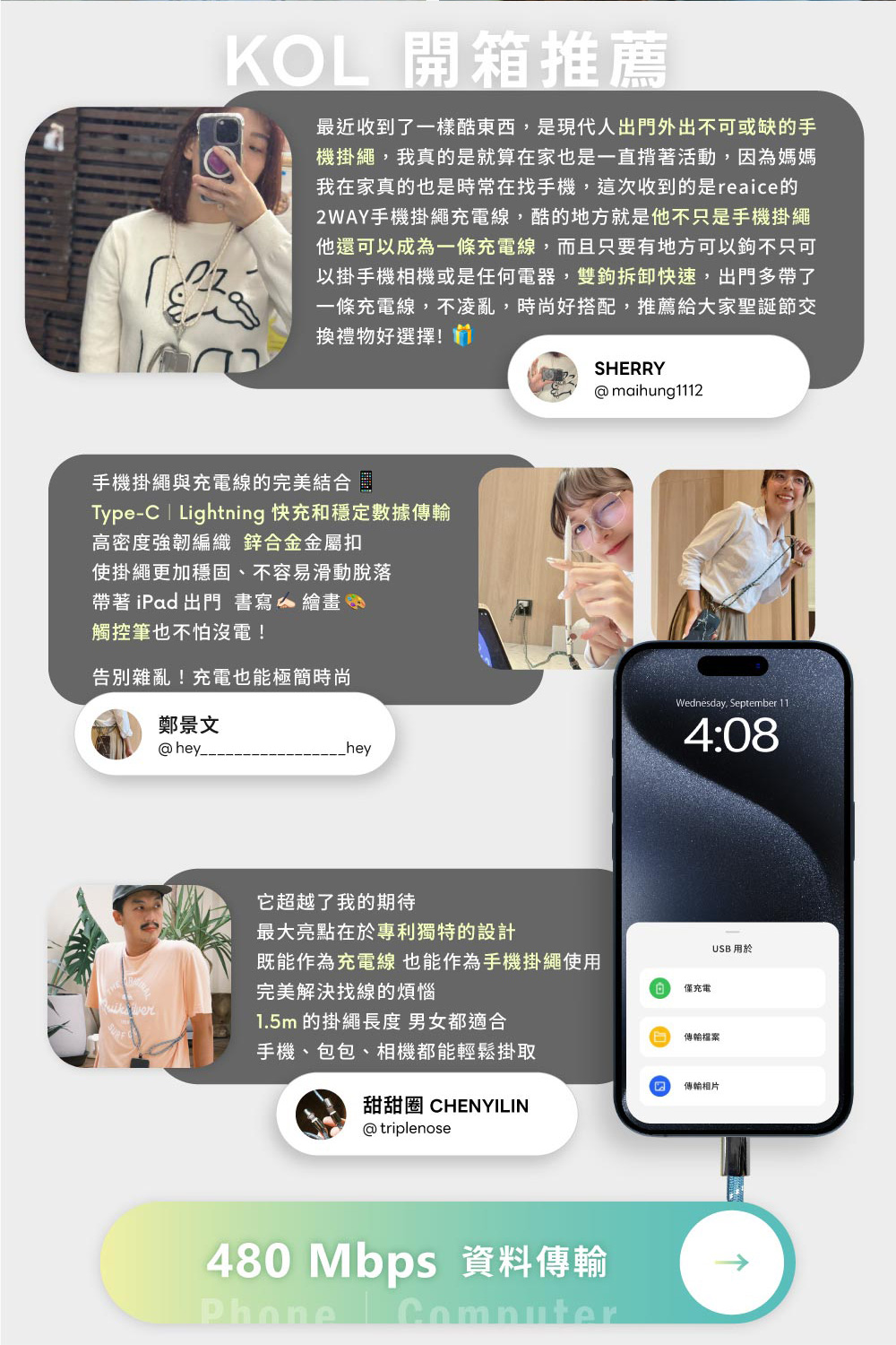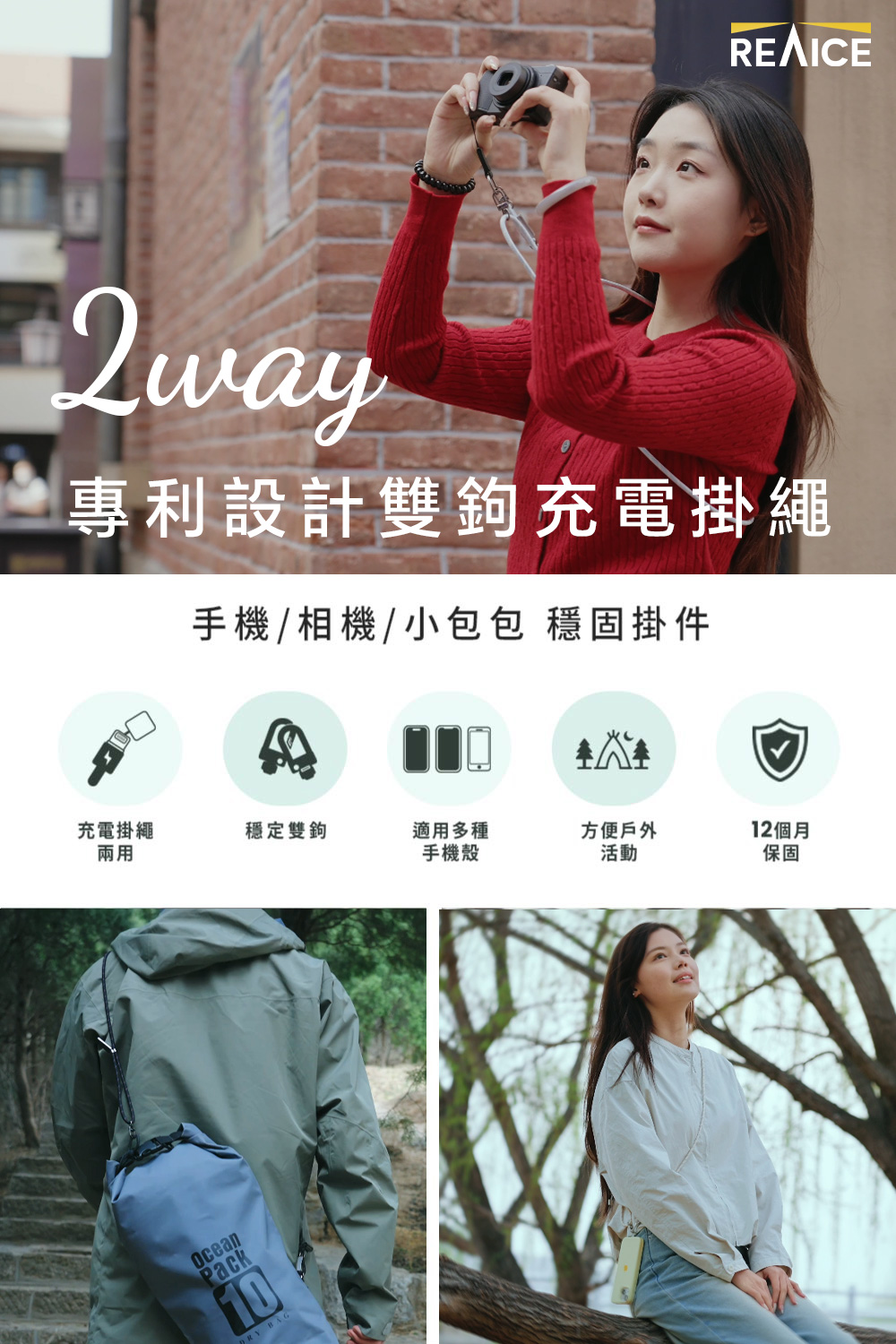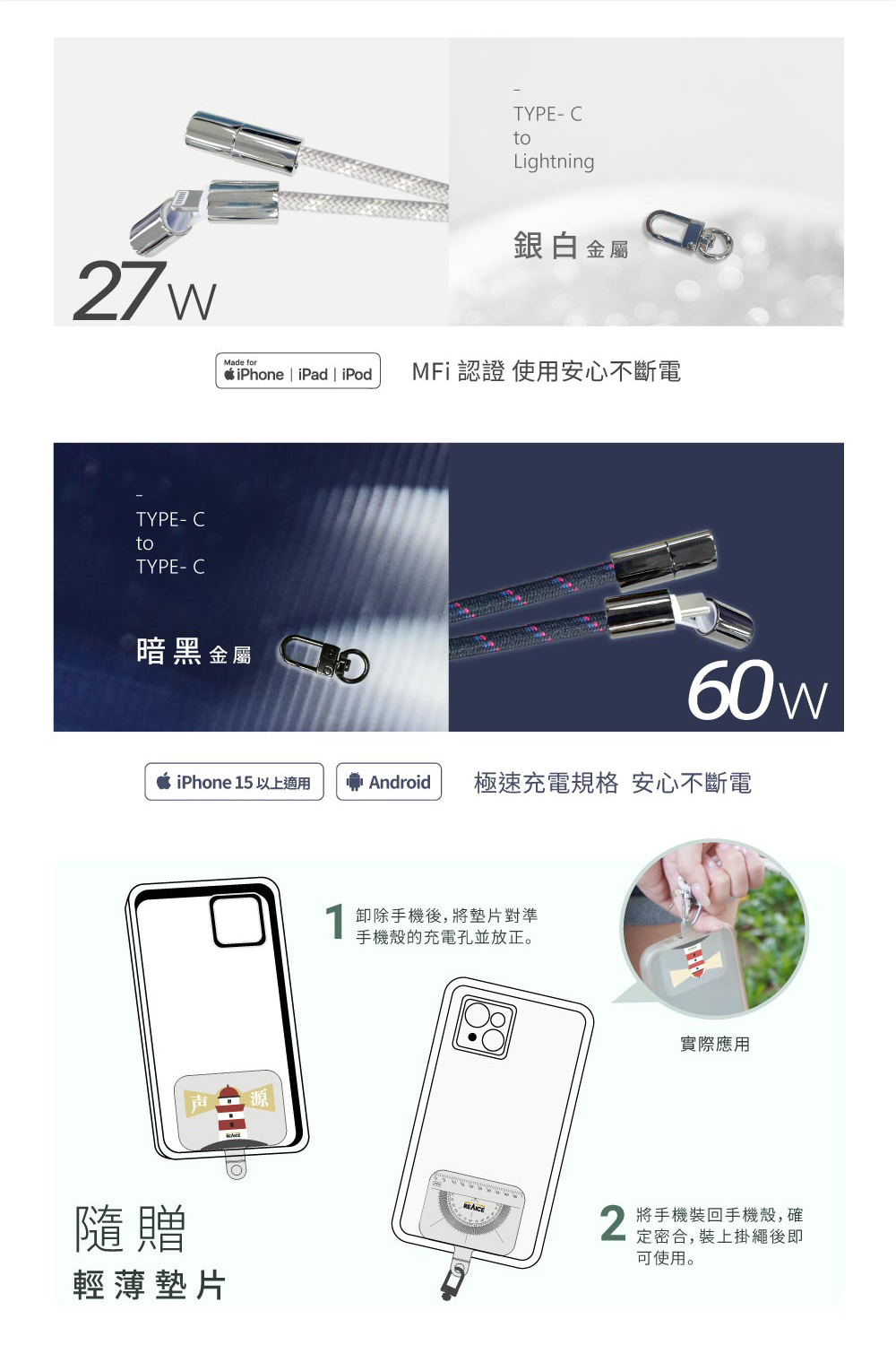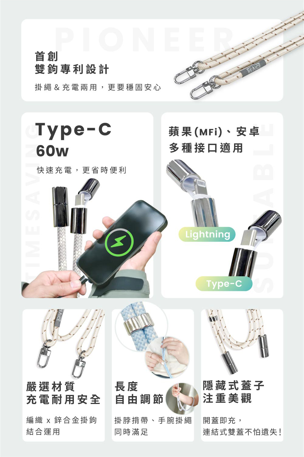 穩固雙鉤掛繩+充電線兩用