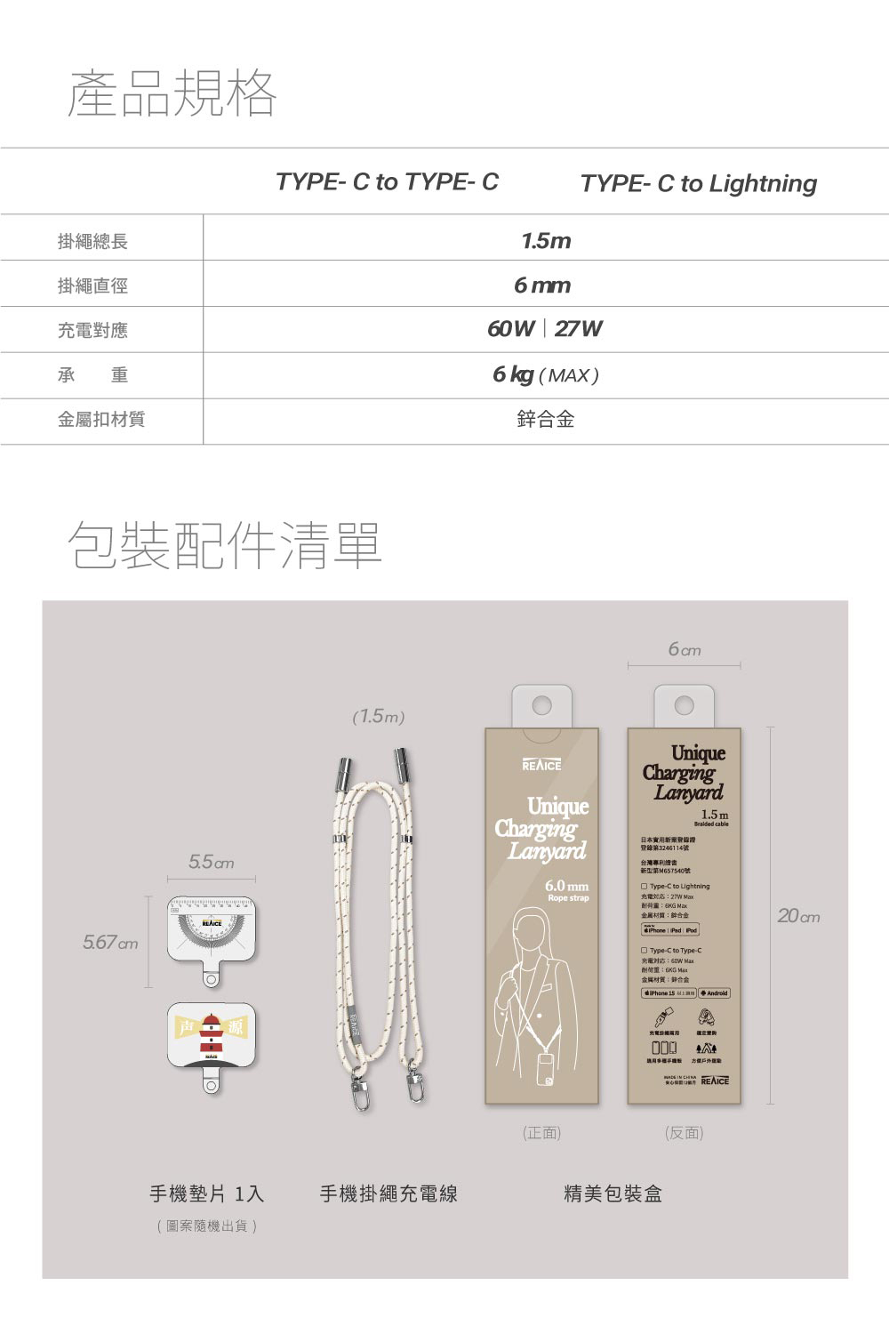 【A+全新福利品】 REAICE 2WAY手機掛繩充電線Type-C to Type-C /多色可選