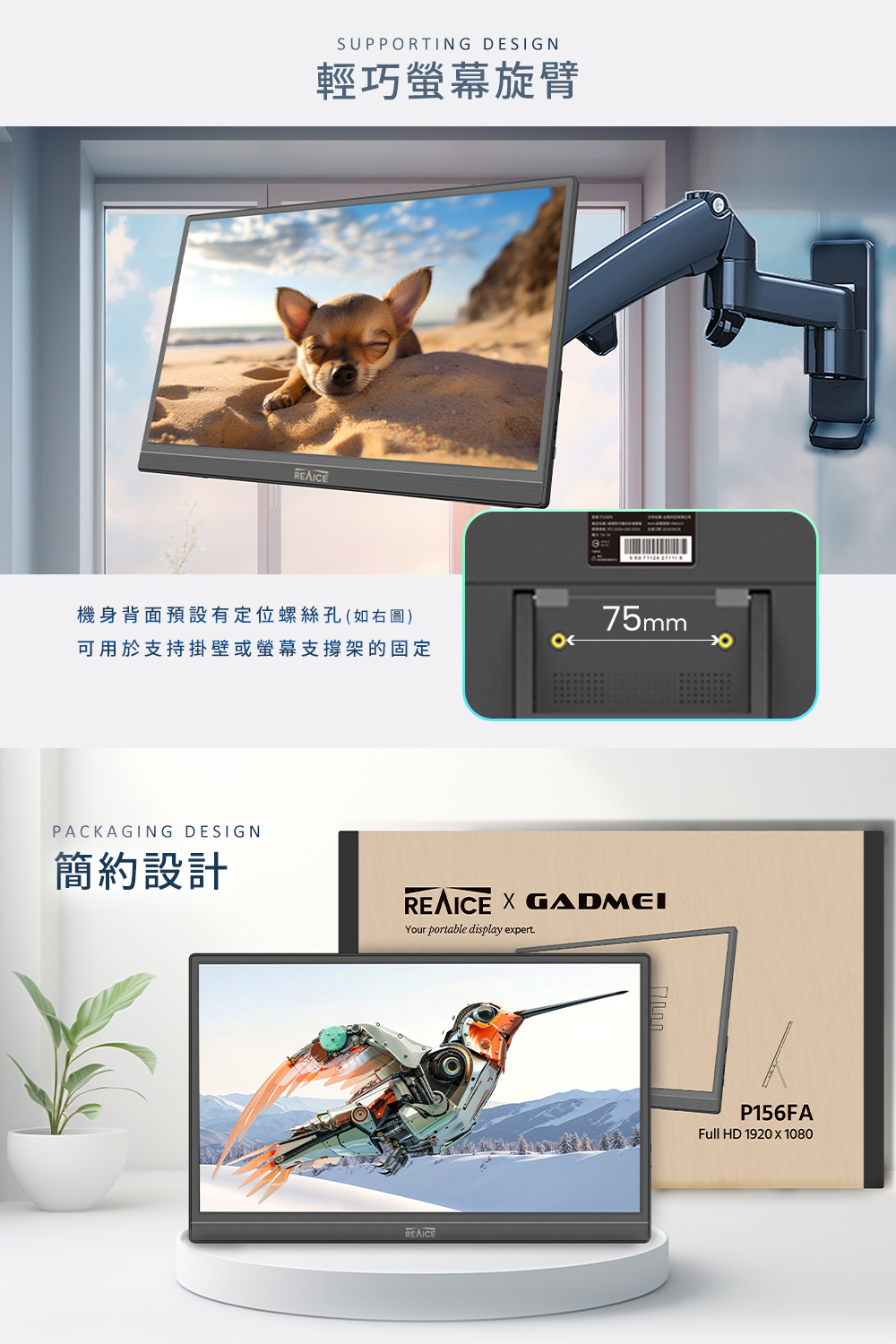 贈螢幕清潔三件組【台陞科技】REAICE 15.6型IPS超薄可攜式外接螢幕 P156FA