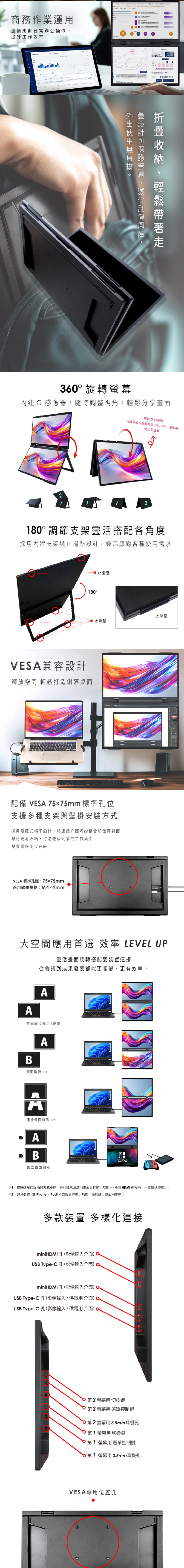 面板類型:TFT IPS(防眩光)螢幕尺寸:15.6 吋解析度:FHD 1920X1080顯示色彩:1670 萬色亮度:250 cd/m2對比度:800 : 1畫面比例:16 : 9視角:廣視角170°色域範圍:45%反應速度:20毫秒更新率:60Hz耗電量:最大20W輸入端:USB Type-C(用於影像輸入/電源)x3 mini HDMIx2輸出端子:耳機插孔3.5mmx2內建喇叭:立體音1WX2機身尺寸:寬353.3X高220X深27毫米重量:約1.85公斤產地:中國1年保固期商檢字號:R3F103*Type C 接口的手機或筆電,要透過Type C 投屏螢幕的話手機或筆電本身要有支援"影像輸出(DisplayPort)",若需此功能的用戶請先確認手機或筆電是否支援。*注意:電腦或手機需能支援 USB-Type C(USB 3.1 映像入力・給電用),請務必確認