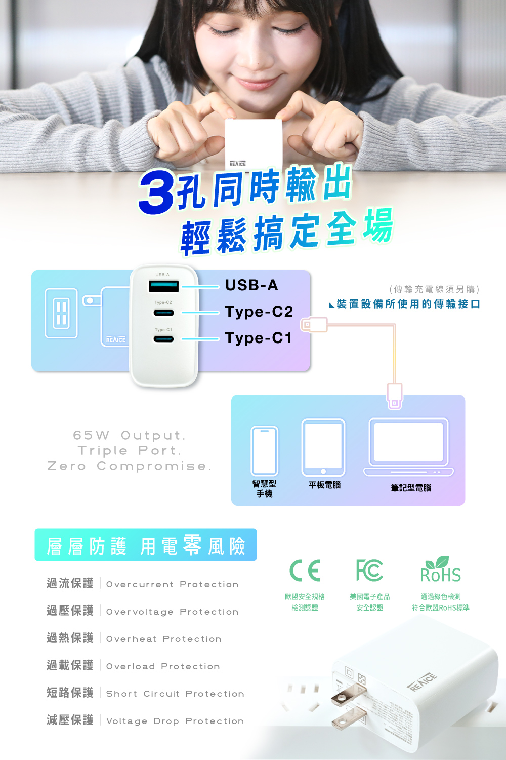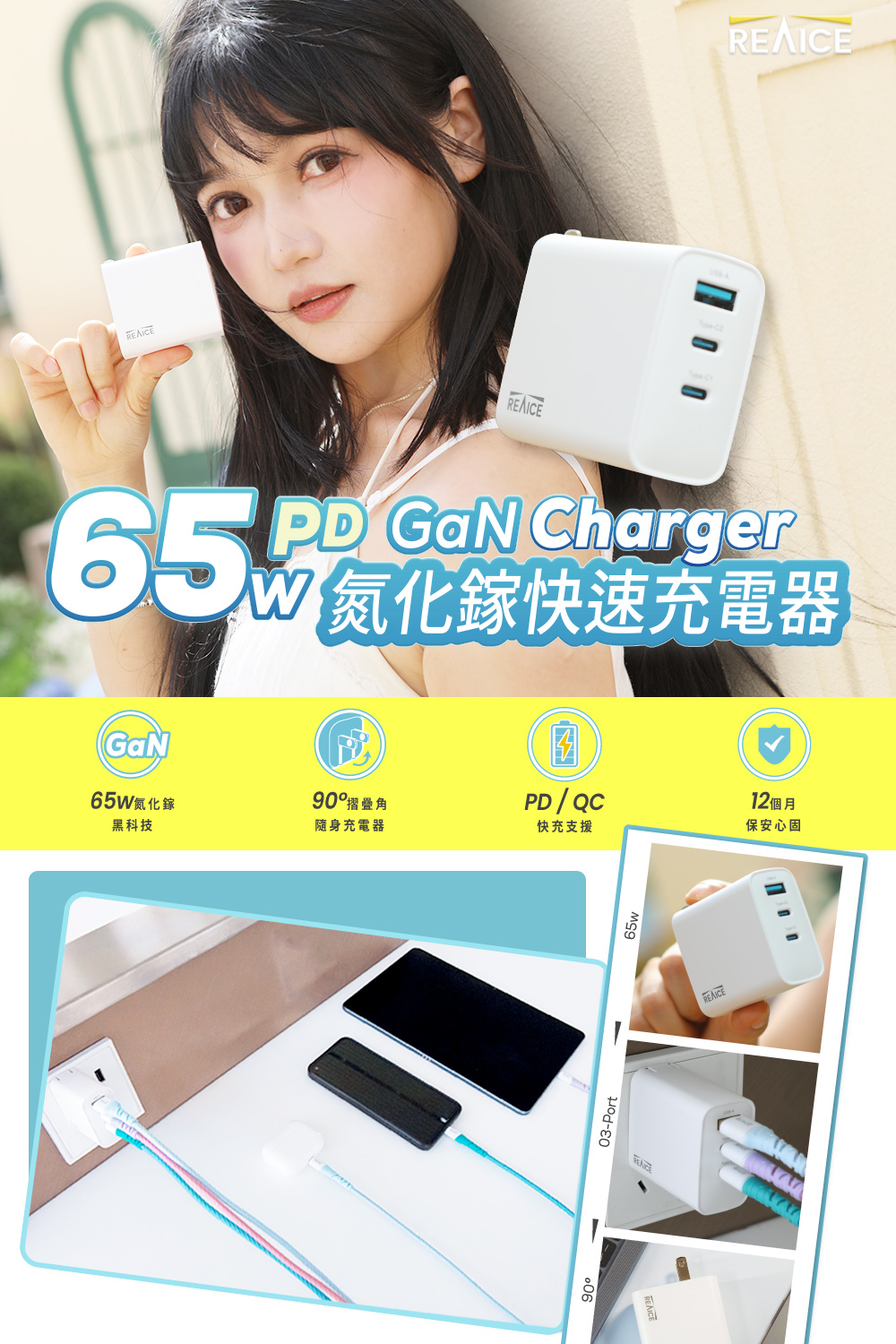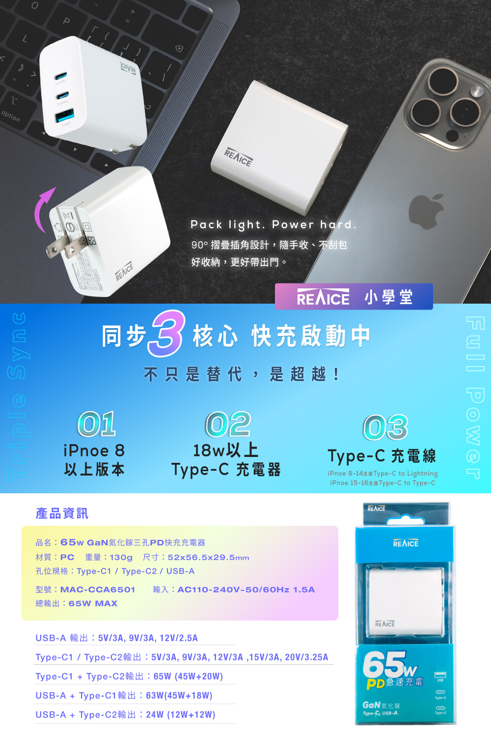 【A+全新福利品】REAICE 65W GaN氮化鎵三孔PD快充充電器 MAC-CCA6501