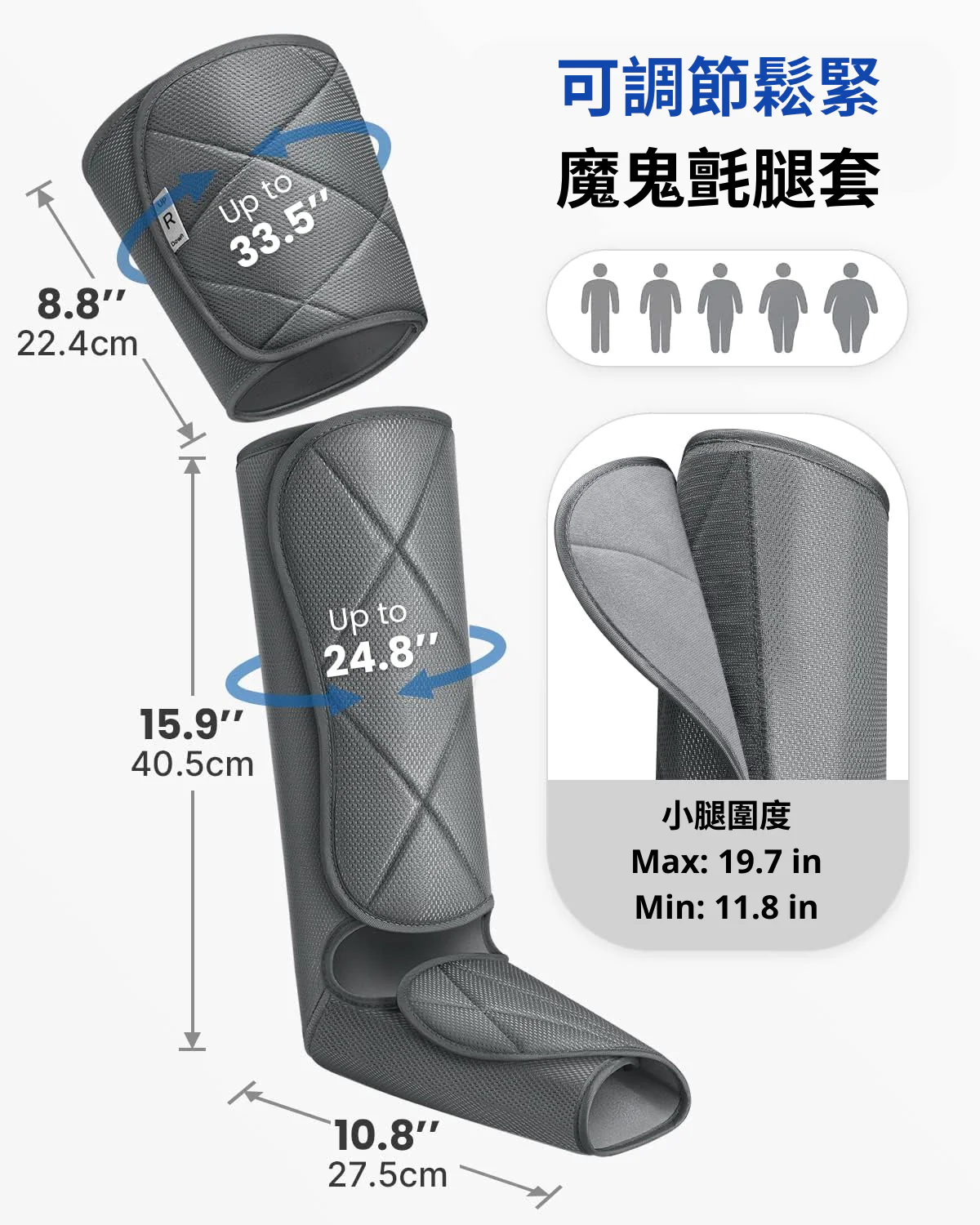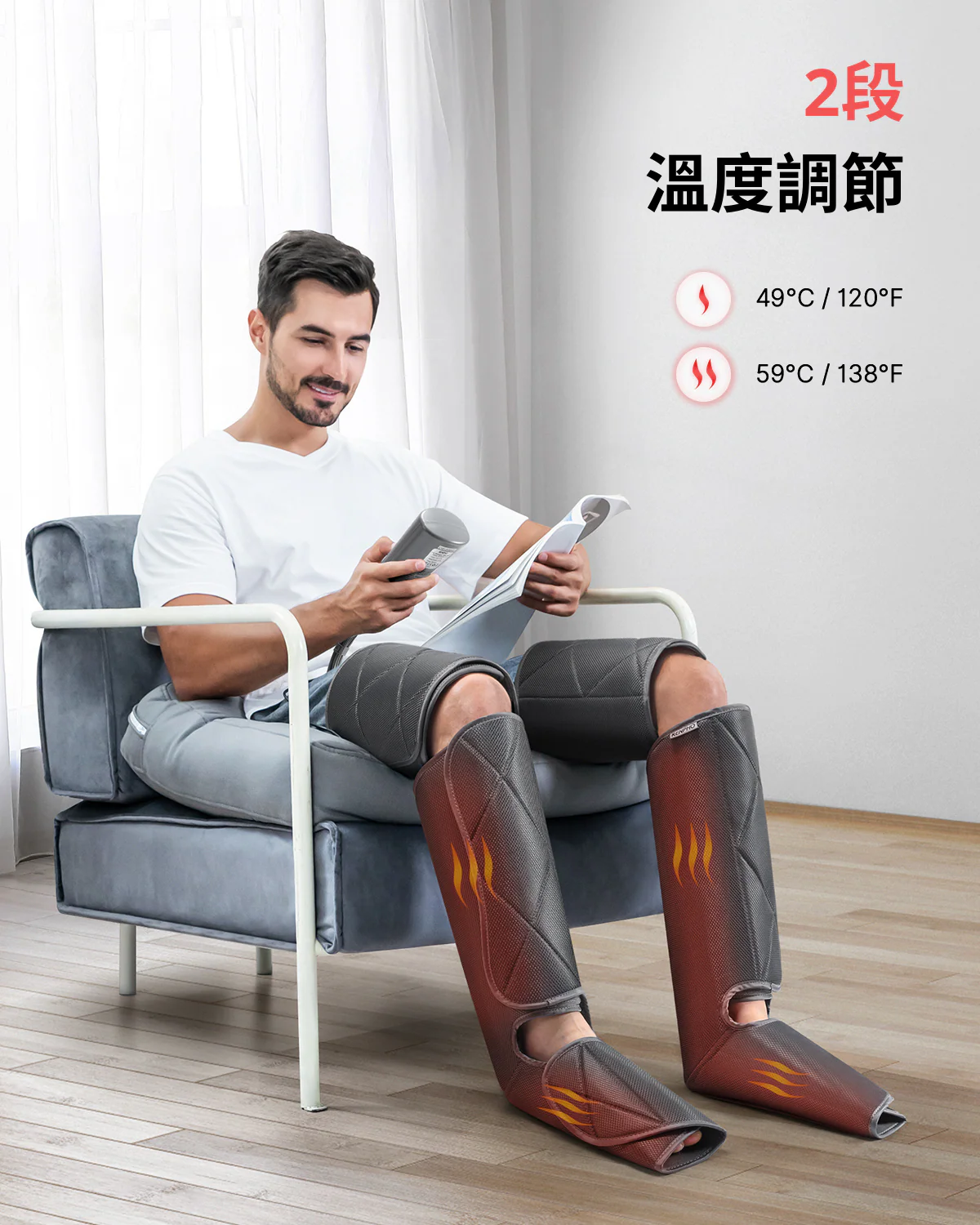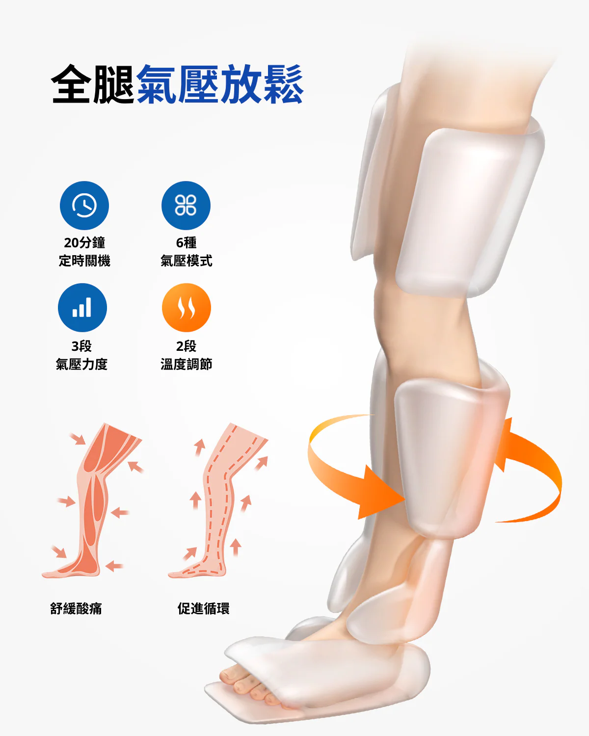 .高效氣壓按摩 大幅減緩腿部不適一天中我們很多時間都是坐著,工作、開車、看書報雜誌、打電腦、滑手機、看電視。久坐之後易造成腿部血液循環不良導致腿部緊繃不適,高效氣壓按摩您的小腿跟腳部放鬆肌肉和增加血液循環可大幅減緩您腿部不適。.6 種多變模式提供具有 3 種自動按壓模式與 3 種指定部位模式。多種模式和強度組合,滿足您的需求及喜好。.2 種熱度調整提供兩種熱度選擇, 第一段微溫適合日常保養,第二段養生適合促進循環。.可調節腿套尺寸腿和腳套可以使用魔鬼氈帶輕鬆調整尺寸,小腿周長的適用範圍為30-50cm,適合大多數人。.智能定時關機預設20分鐘自動計時按摩功能,保護肌肉,避免使用過度與按摩器過熱。.產品規格- 產品型號:RP-ALM070H- 尺寸 : 38.2 x 7.5 x 11.5 cm(公分)- 定時時間:20 分鐘- 氣壓囊:單腿6顆,兩腿共12顆- 輸入電壓:100-240V AC 50/60Hz 0.8A- 輸出電壓:12V ⎓ 2.0A- 消耗功率:24W- 重量 : 1.64 kg(公斤)- 製造地:中國- BSMI:R3F011▲ 注意事項:1. 請勿持續在同一部位使用超過30分鐘。2. 請勿在骨骼、肌肉薄弱的部位上使用。3. 請勿對嬰幼兒、未成年、孕婦、佩帶起搏器、骨折者使用。4. 如有不適,請立即停用。5. 本產品並不能取代醫療儀器,無法治療任何疾病或解決醫療問題。