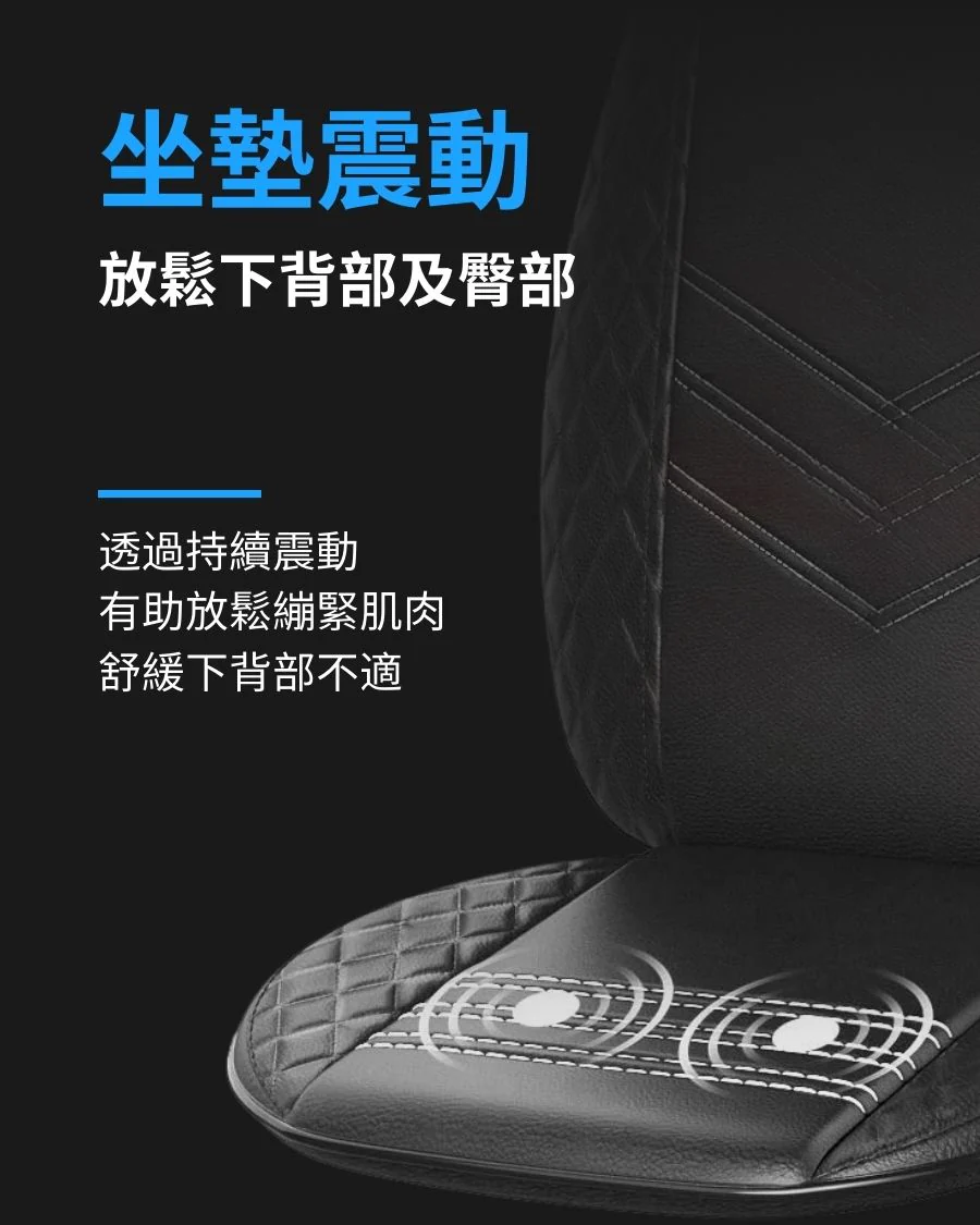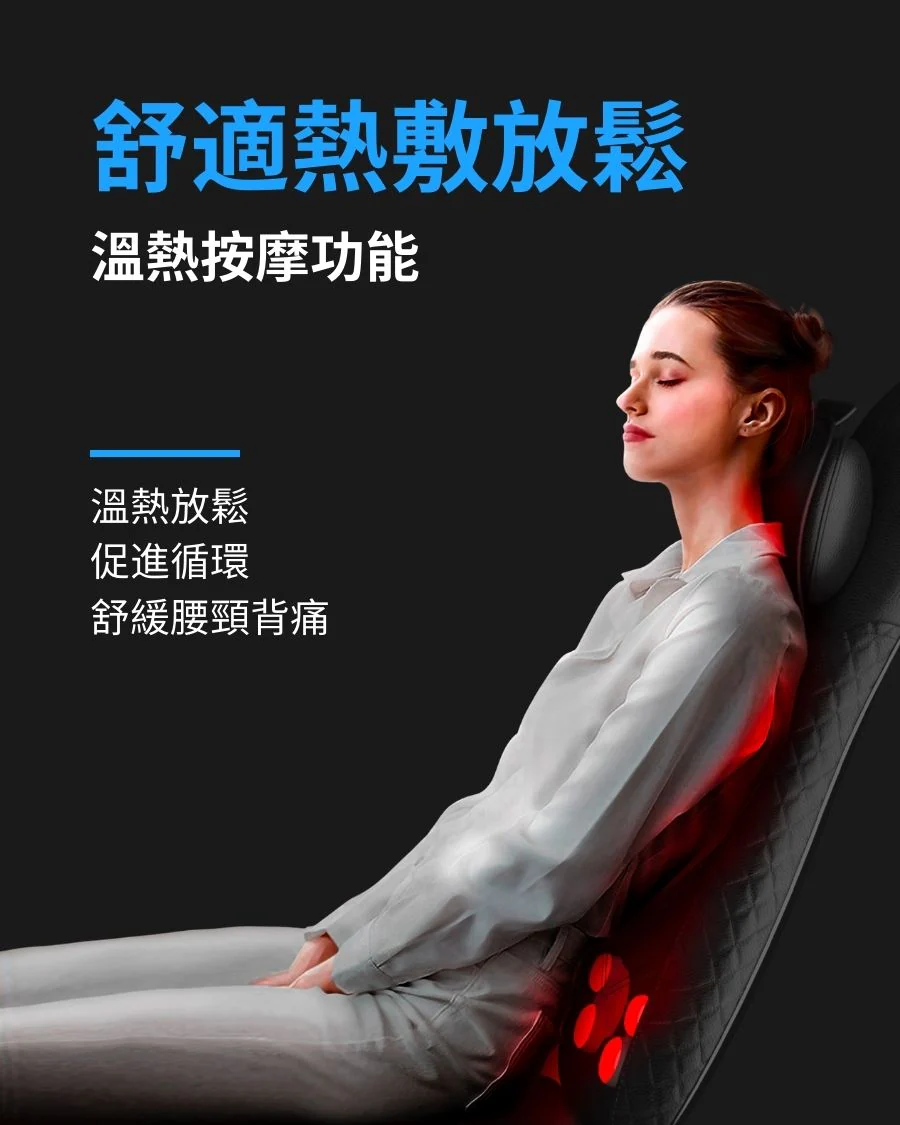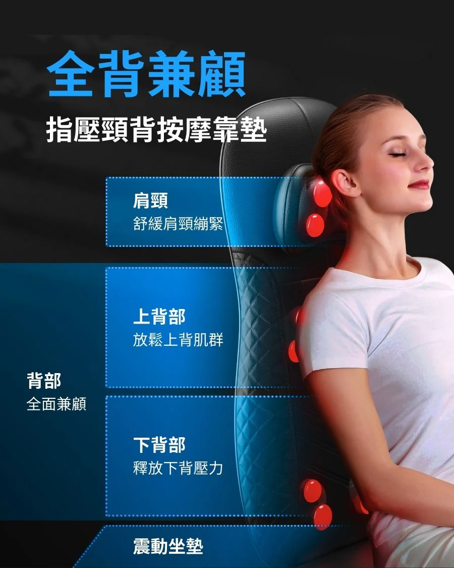 .指壓頸背按摩靠墊現代人每天在辦公室對著電腦工作。不少人養成了久坐、坐姿不當及寒背等等不良習慣。這些不良習慣有機會傷及肩頸及背部,令不少人飽受退化性椎間盤疾病及坐骨神經痛等痛症的折磨。這款按摩靠墊可在家中或辦公室使用。極致舒適的按摩體驗,有效舒緩不適,亦有助血液循環。使您能夠放鬆身心、釋放壓力,恢復精神及活力!.可調節式頸部按摩枕這款按摩靠墊配有可調式按摩頸枕,能夠有效放鬆您的肩頸肌肉群;按摩頸枕可垂直調節高度,能夠完美貼合您的頸部,適合不同身高的家庭成員。.背部指壓按摩滾輪這款按摩靠墊設有8個深層揉捏按摩滾輪,使整個背部得以放鬆。有3個按摩位置可供選擇:全/上/下背部按摩。亦可固定在特定痛點位置進行針對性按摩。.具加熱功能及坐墊震動功能這款按摩靠墊設有溫熱按摩功能及坐墊震動功能,讓您享受更舒適的按摩體驗。頸部及背部的加熱功能可促進血液循環,同時放鬆頸部、背部、腰部及肩膀的緊張肌肉。坐墊震動功能設有3級強度可調節,可放鬆臀部和大腿。▲ 請注意,坐墊上並未設有加熱功能。.多種按摩計時設定提供 15 / 20 / 25 分鐘計時按摩,輕鬆訂定一天背部按摩時長,保護背部肌肉,同時避免使用過度。.極致舒適的按摩靠墊靠墊設有綁帶可將按摩靠墊固定在不同的椅子上,可在梳化、躺椅、辦公椅或餐椅上使用,讓您在家中或辦公室,隨時隨地享受極致舒適的按摩體驗。.耐用、易於清潔高品質的人造皮革使這款按摩椅墊更加耐用,易於清潔及保養。.送禮自用皆宜都市人每天都面對肩、頸及背部的各種不適,因此需要為這些部位進行按摩放鬆。每天使用頸背按摩靠墊,有助維持身體健康,送禮、自用都非常適合。產品規格:產品型號:RF-BM066尺寸:40 x 43 x 78 cm (公分)定時時間:15 / 20 / 25 分鐘額定電壓:12V⎓額定電流:5.0A額定功率:60W重量:5.1 kgs(公斤)保護裝置:本機器有過熱保護裝置製造地:中國BSMI:R3F011▲ 注意事項:1. 請勿在汽車駕駛座椅上使用此按摩靠墊。2. 不建議將按摩墊完全放平使用。3. 請勿直接使皮膚與產品接觸。如發現強度太高,請在身體和按摩器之間蓋上毯子。4. 請勿過度用力靠在按摩器上。5. 切勿在腫脹、發炎的區域直接使用本產品。6. 本產品並不能取代醫療儀器,無法治療任何疾病或解決醫療問題。