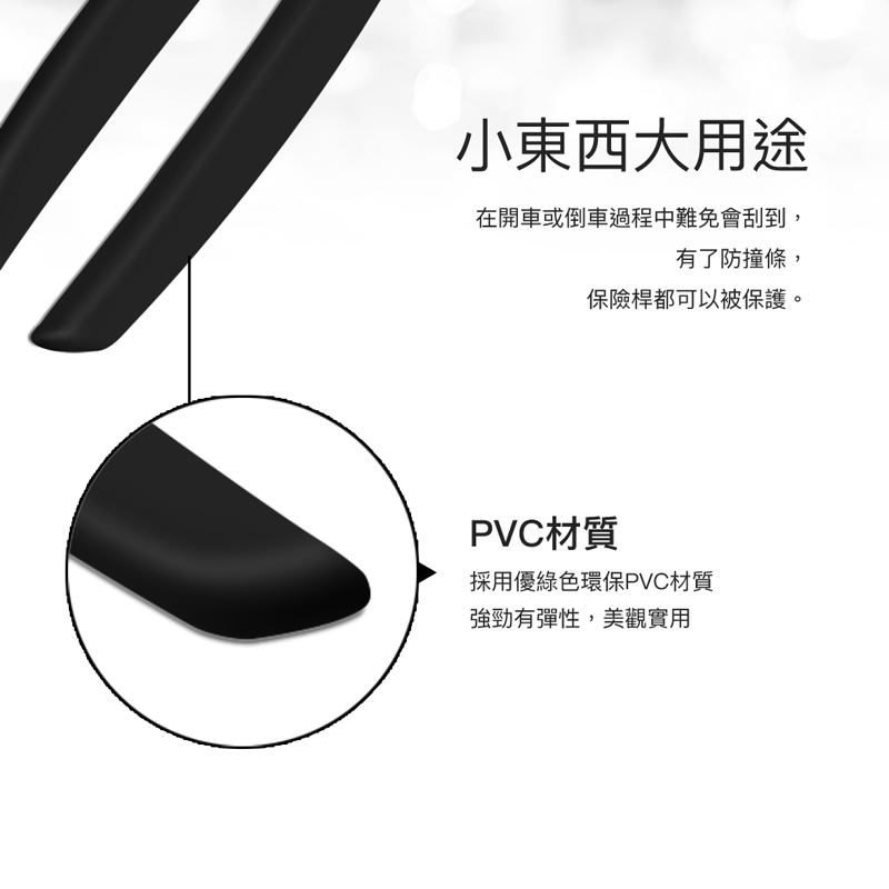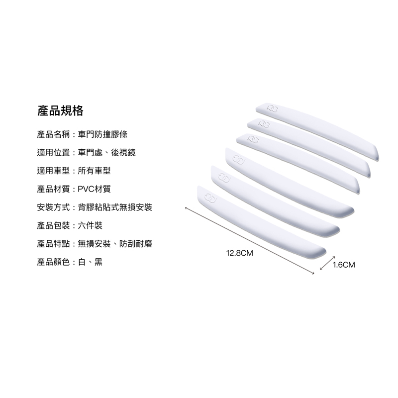 原廠正貨,快速出貨,保固1個月品名:RG車門防撞保護膠條顏色:黑、白單尺寸:12.8 × 1.6 cm數量:6個材質:PVC產地:CHINA使用方法1. 先清除安裝位置上的灰塵或油污。2. 撕開背面防撞條膠帶,緊密壓合黏合處。3. 安裝期間24小時內避免碰到水。商品主特色吸收衝擊力,避免碰撞刮傷商品短敘述.光滑表面安裝簡便.耐磨材質.顏色簡約可搭配車系顏色#防撞膠條 #安全泡棉 #安全防撞膠條 #兒童防撞 #車門防撞