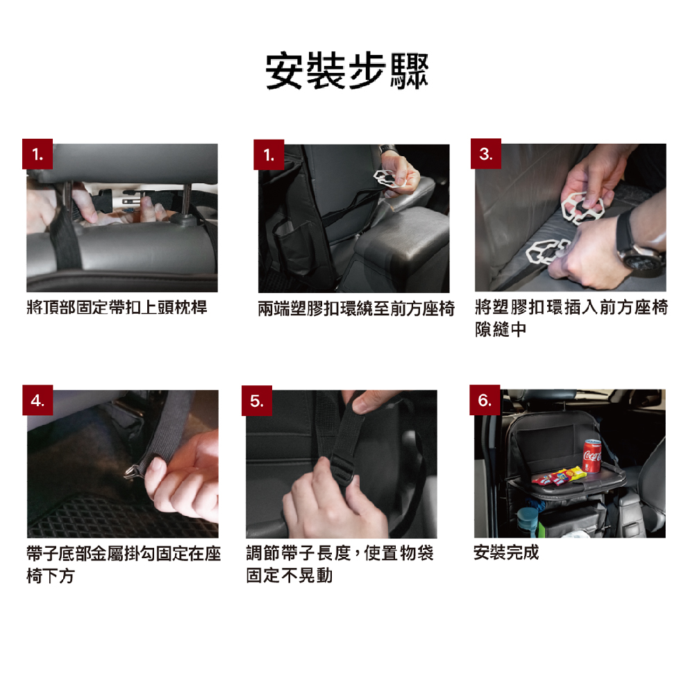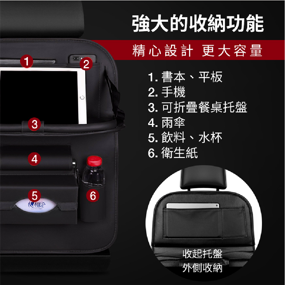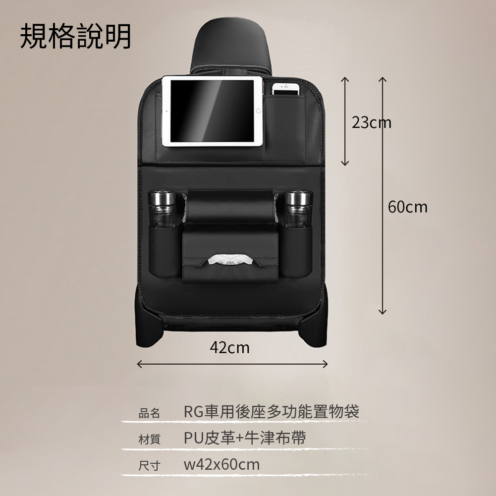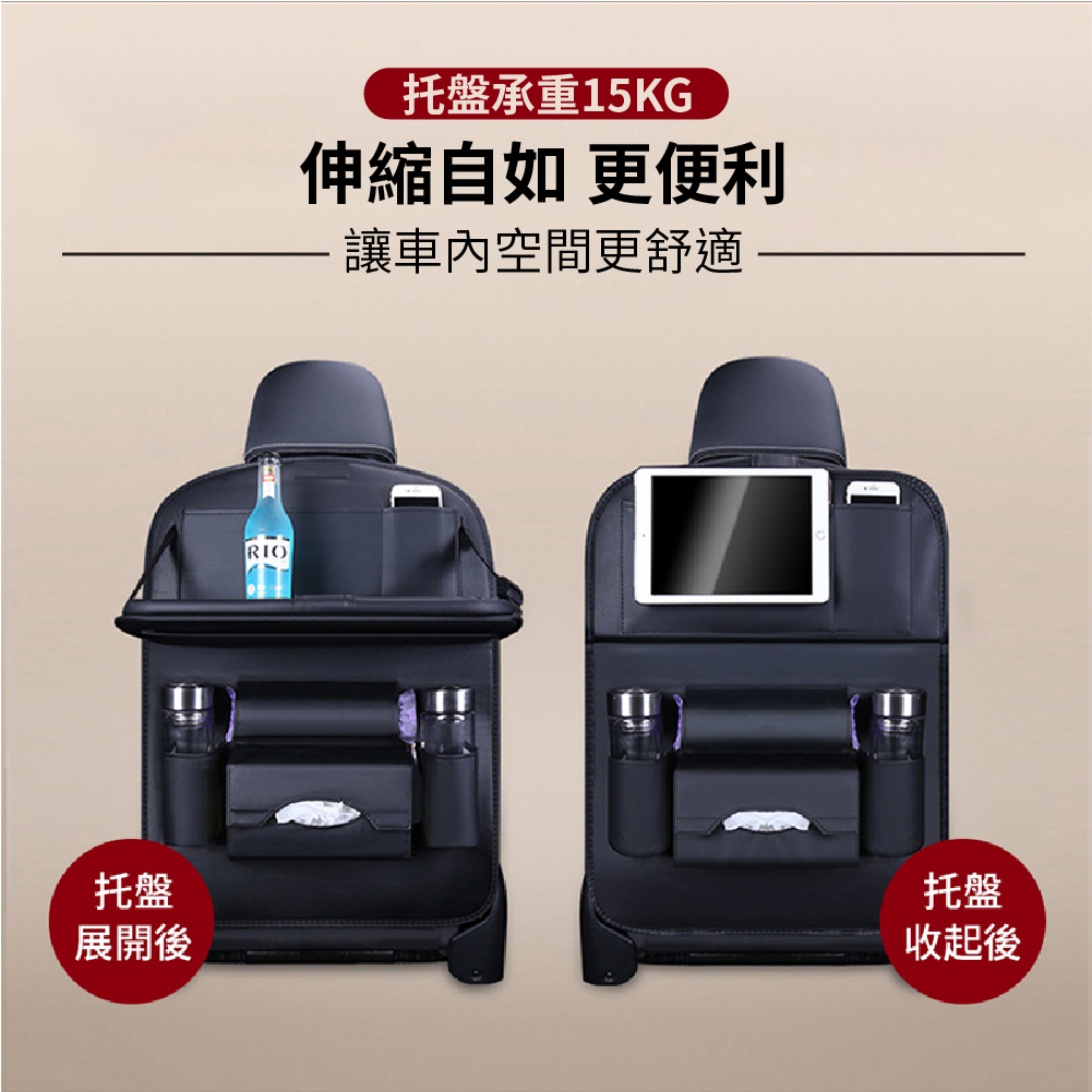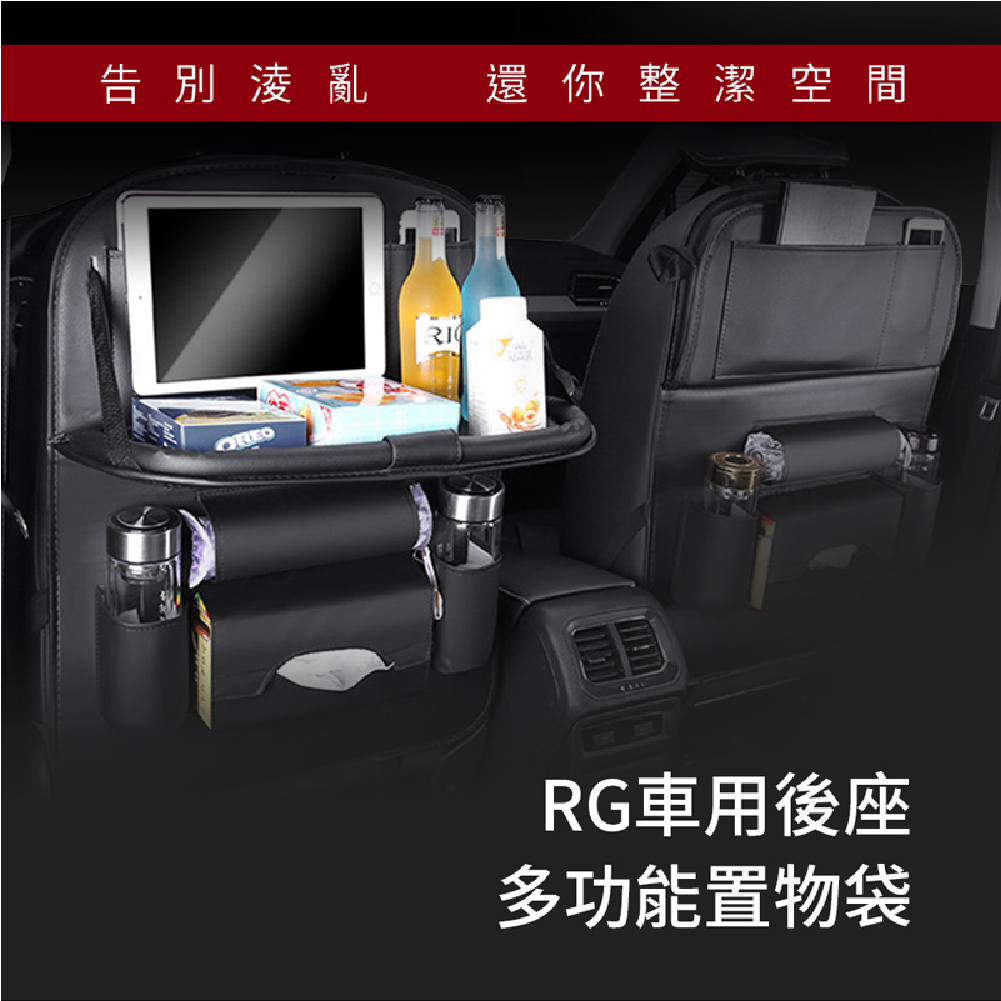 品名:RG車用後座多功能置物袋材質:優質皮革+牛津布帶 尺寸:長60cm,寬42cm安裝步驟說明1.將折疊餐架椅背收納袋打開討在座椅上2.將頂部固定在座椅頭枕下3.底部掛勾固定在座椅金屬桿上4.拉出背部扣,調整適合平整位置固定住 商品主特色安裝方便、伸縮自如商品短敘述.採用PU皮革製作,防水防塵.置物板加厚設計,更加穩重及耐用.優質皮革 牛津布帶#置物袋 #椅背托盤 #椅背收納 #置物盤 #托盤 #椅背收納 #托盤乘重15公斤
