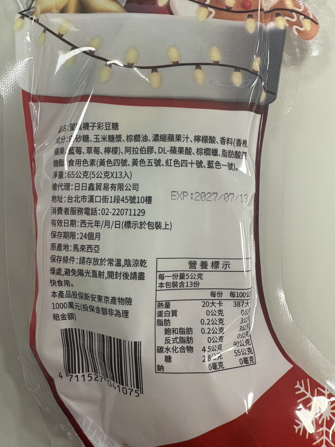 聖誕節糖果 派對活動糖果 學校補習班糖果 聖誕襪子彩豆糖 脆皮軟糖 65g(5g*13入) [8支免運組]