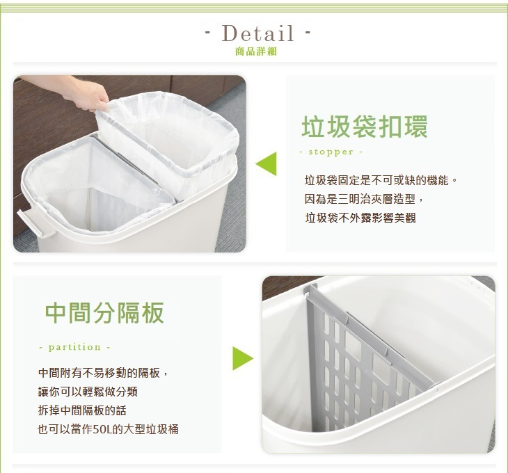 特殊防水設計的蓋子,雨水也不易進入蓋子打開即關閉角度各有45及全開模式兩種階段貼心的分類隔板及分開蓋子,讓你只需要打開想投入的一方即可蓋子與本體也附有扣鎖,牢固不易脫落內部附有垃圾袋扣環,垃圾袋不外露尺寸:長30.2×寬45.7×高59.5(cm)顏色 : 淺灰色材質: PP容量: 53L產地: 日本重量: 2.513kg