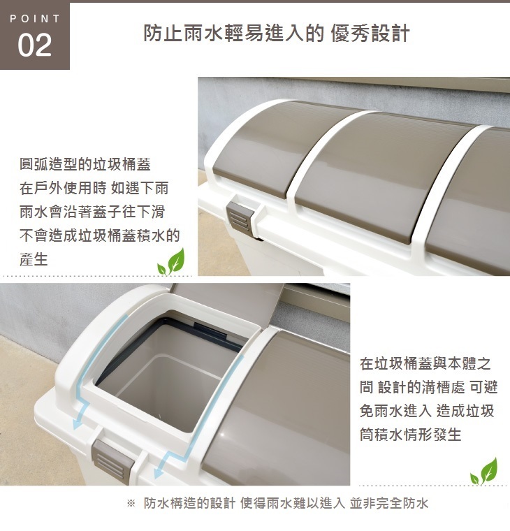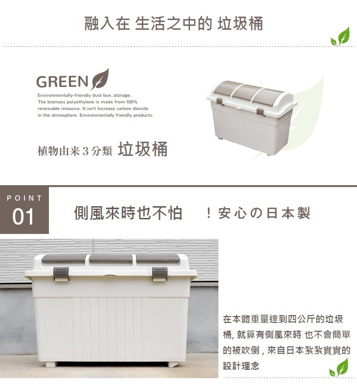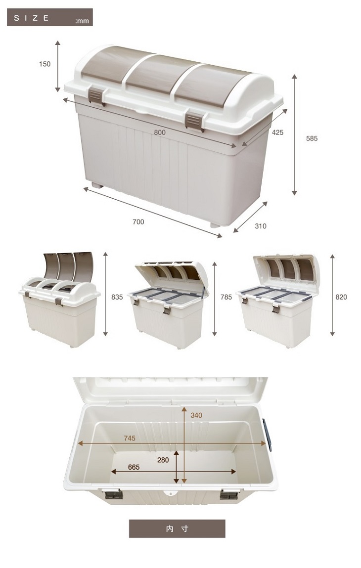 來自日本收納暢銷品牌大容量的收納功能 可簡單分隔使用全可拆解上蓋與桶身 清洗更輕鬆紮實沉穩的桶身 放置戶外也不怕大風吹擊尺寸: 800 × 425 × H585 mm重量:4.8kg材質: PP 容量: 約100L(約33L+約33L+約33L)原産國:日本