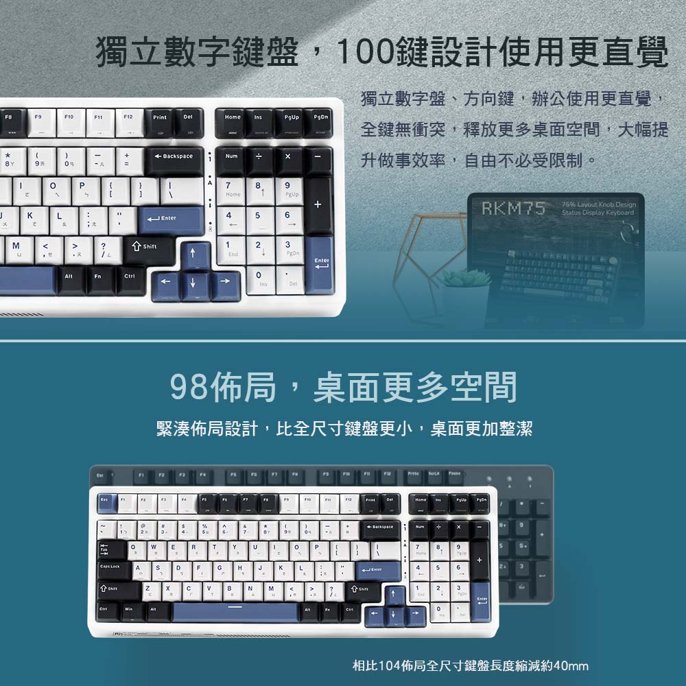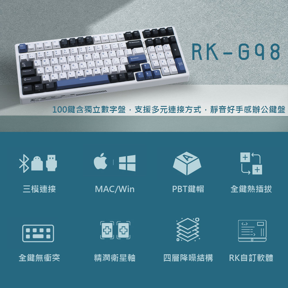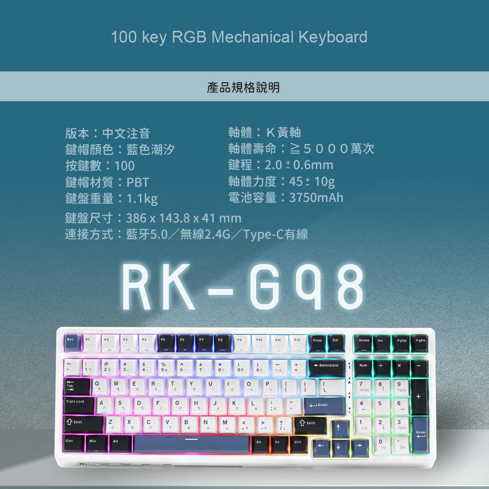 含數字盤100鍵配置,靜音好手感辦公鍵盤✅獨立數字盤,辦公使用更便利✅ PBT鍵帽,磨砂質感更耐用✅藍牙5.0 / 2.4Ghz無線連接 / TYPE-C有線連接✅ Windows / Mac 雙系統快速切換✅ 熱插拔軸座,可更換3腳、5腳機械軸✅ 3750 mAh大電量,可連續使用250小時✅ 原廠RK編輯軟體,設定巨集多功能按鍵及自訂RGB燈光效果✅ 一年官方保固RK G98 藍色潮汐,採用深藍、淺藍、純白三種顏色PBT鍵帽,營造出不同時間潮汐的樣貌。G98提供100鍵鍵位設計、獨立的數字盤,更利於辦公使用,且有四層隔音棉、好手感的K黃軸,讓使用者可享有安靜好手感的使用回饋感。此鍵盤支援藍芽、2.4G無線、TYPE-C有線連接模式,可同步連接3台藍牙設備,並自由切換Windows / Mac 雙系統,滿足多元化的工作與跨平台操作需求。此鍵盤也提供熱插拔軸座,不需焊接,僅使用隨贈的鋼絲拔鍵軸器,即可自由更換軸體,創造出獨一無二的打擊手感,滿足多樣化的DIY需求。【產品規格】: 鍵盤軸體:k黃軸(支援熱插拔)觸發行程:2.0 mm壓力克數:50g按壓手感:線性總鍵程:4.0 mm按鍵聲音:無聲平均按壓次數:5000萬次按鍵數:100鍵帽材質:PBT鍵帽印字:二色字符語系:中文鍵帽高度:原廠高度多媒體支援:輔助FN連接介面:藍牙5.0 / 2.4G無線 / TYPE-C有線鍵盤尺寸:386 x 143.8 x 41 mm鍵盤重量:1.1kg外盒尺寸:413 x 191 x 46 mm包裝總重量:1.4kg電池容量:3750 mAh / 充電約需6~7小時 /滿電燈效最亮+無線模式約可連續使用24小時/待機可長達2800小時※實際狀況因使用狀況而異注意事項:充電請以USB(5V 1A)有線模式(不支援快充/豆腐頭)適用系統:Windows/MAC / IOS / Android