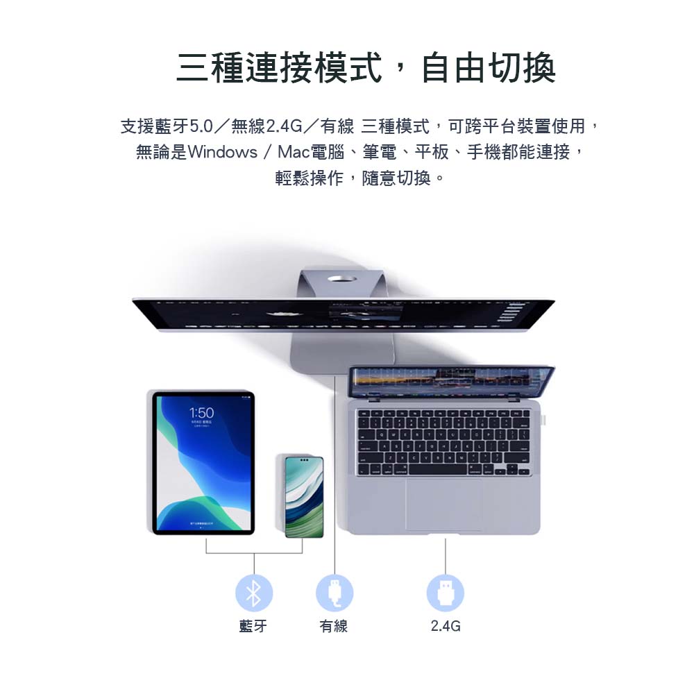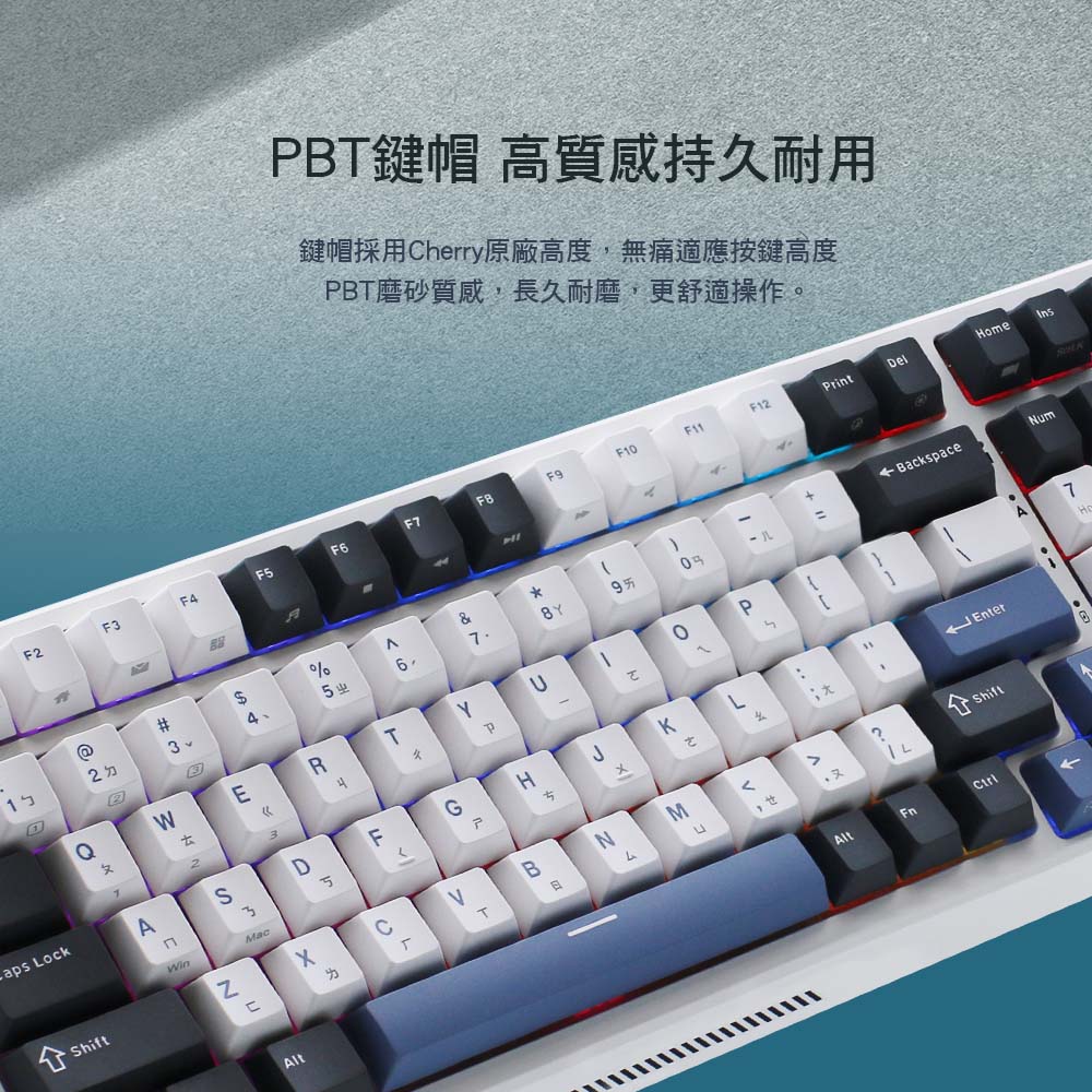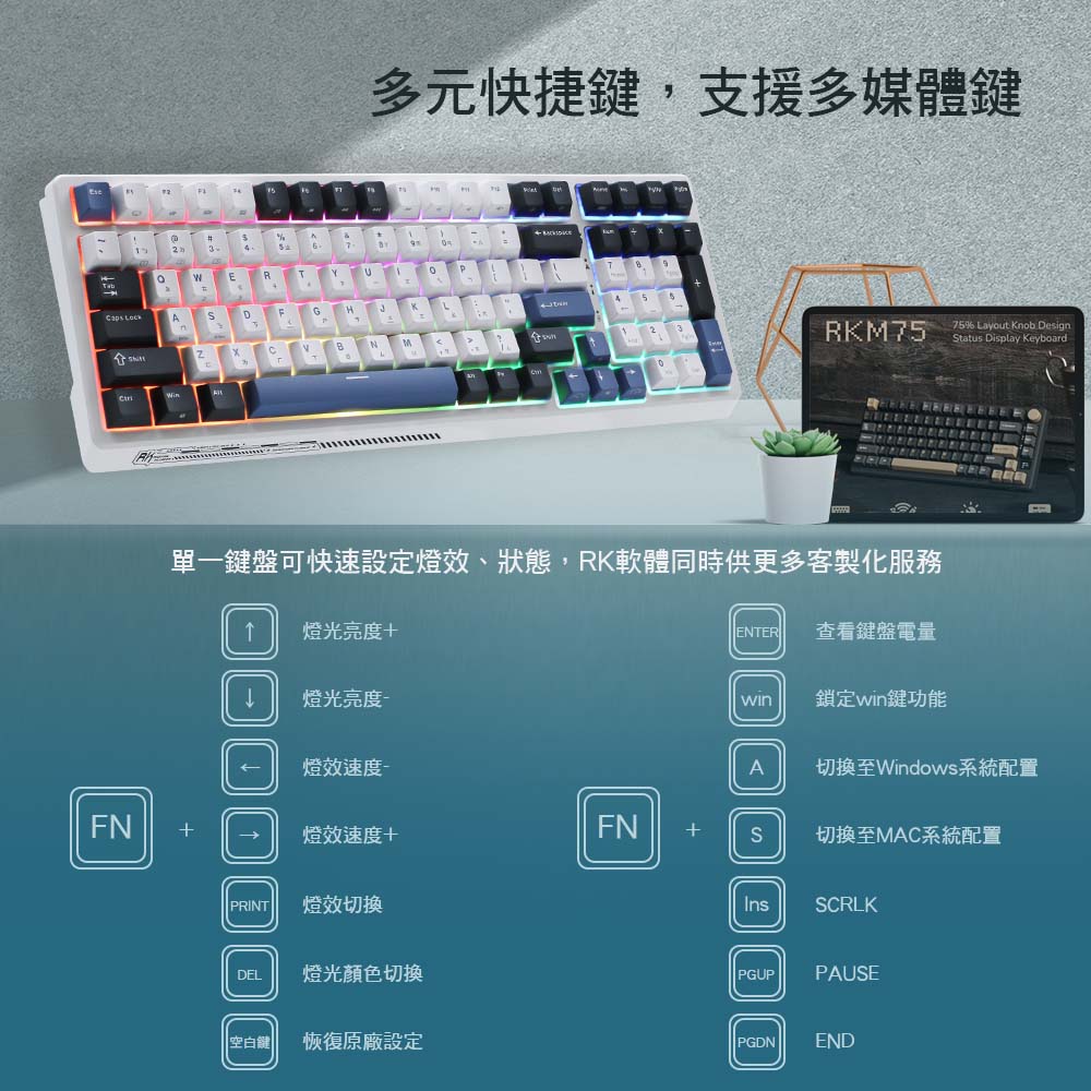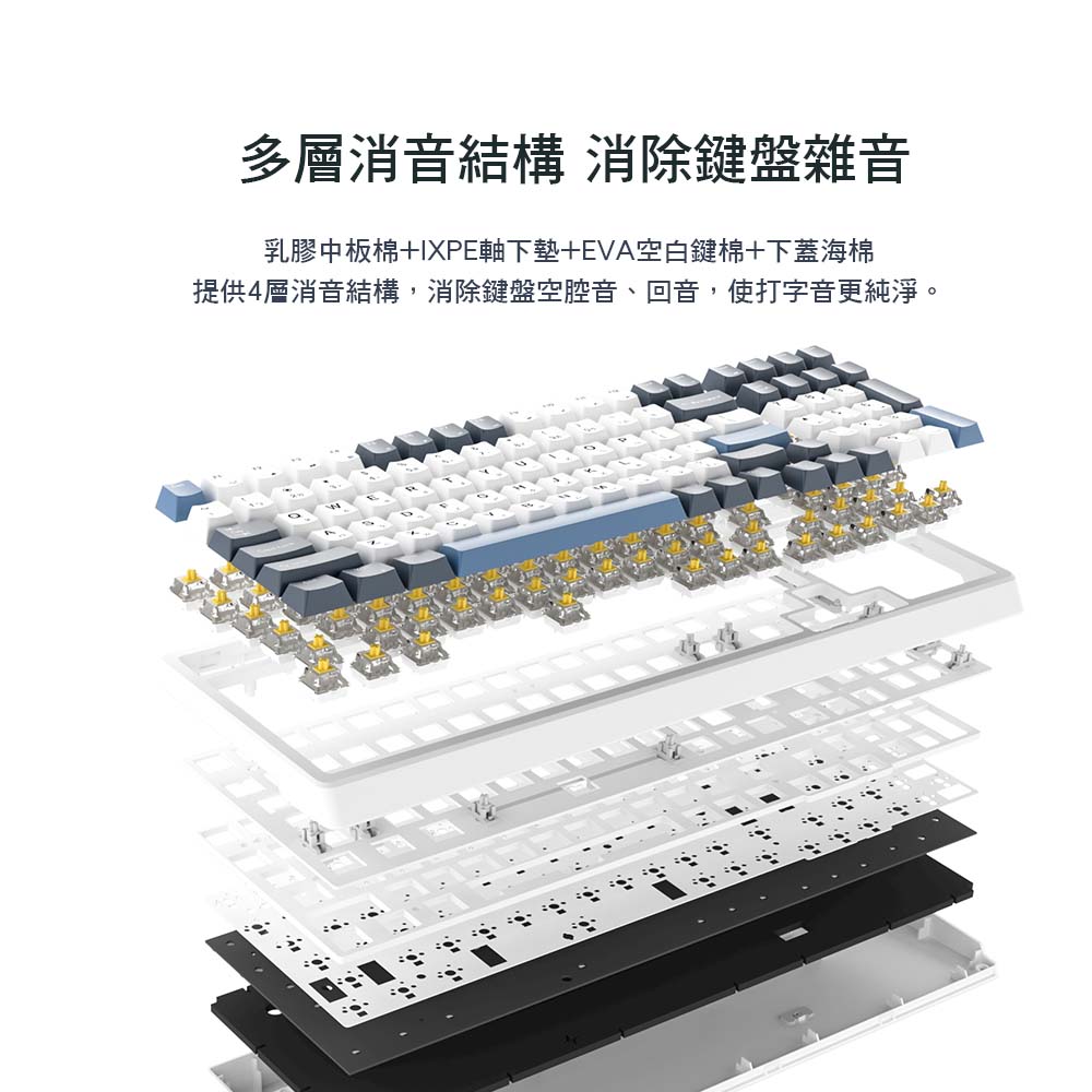 含數字盤100鍵配置,靜音好手感辦公鍵盤✅獨立數字盤,辦公使用更便利✅ PBT鍵帽,磨砂質感更耐用✅藍牙5.0 / 2.4Ghz無線連接 / TYPE-C有線連接✅ Windows / Mac 雙系統快速切換✅ 熱插拔軸座,可更換3腳、5腳機械軸✅ 3750 mAh大電量,可連續使用250小時✅ 原廠RK編輯軟體,設定巨集多功能按鍵及自訂RGB燈光效果✅ 一年官方保固RK G98 藍色潮汐,採用深藍、淺藍、純白三種顏色PBT鍵帽,營造出不同時間潮汐的樣貌。G98提供100鍵鍵位設計、獨立的數字盤,更利於辦公使用,且有四層隔音棉、好手感的K黃軸,讓使用者可享有安靜好手感的使用回饋感。此鍵盤支援藍芽、2.4G無線、TYPE-C有線連接模式,可同步連接3台藍牙設備,並自由切換Windows / Mac 雙系統,滿足多元化的工作與跨平台操作需求。此鍵盤也提供熱插拔軸座,不需焊接,僅使用隨贈的鋼絲拔鍵軸器,即可自由更換軸體,創造出獨一無二的打擊手感,滿足多樣化的DIY需求。【產品規格】: 鍵盤軸體:k黃軸(支援熱插拔)觸發行程:2.0 mm壓力克數:50g按壓手感:線性總鍵程:4.0 mm按鍵聲音:無聲平均按壓次數:5000萬次按鍵數:100鍵帽材質:PBT鍵帽印字:二色字符語系:中文鍵帽高度:原廠高度多媒體支援:輔助FN連接介面:藍牙5.0 / 2.4G無線 / TYPE-C有線鍵盤尺寸:386 x 143.8 x 41 mm鍵盤重量:1.1kg外盒尺寸:413 x 191 x 46 mm包裝總重量:1.4kg電池容量:3750 mAh / 充電約需6~7小時 /滿電燈效最亮+無線模式約可連續使用24小時/待機可長達2800小時※實際狀況因使用狀況而異注意事項:充電請以USB(5V 1A)有線模式(不支援快充/豆腐頭)適用系統:Windows/MAC / IOS / Android