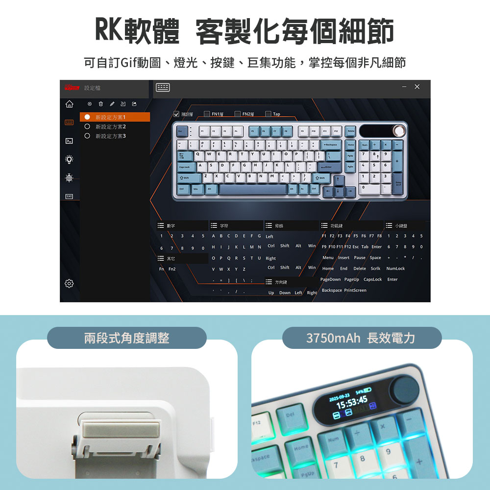 RK S98在96%配置,提供98鍵按鍵位設計,配有金屬材質旋鈕,以及可自訂gif動圖之小螢幕,給電腦桌面帶來嶄新使用情境。