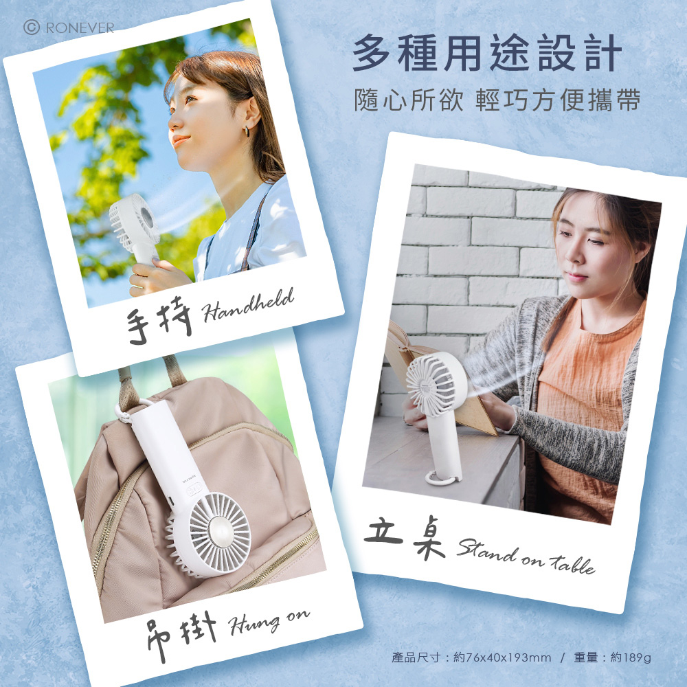 • 外觀簡約質感,小巧輕便,外出好攜帶,可帶上機出國。• 3段風速調節,可依照個人喜好需求調節。• 具有手持、立桌、吊掛三種方式,適合多種用途。• 內置4000mAh充電大電池,續航力更持久。• 智能冰敷技術,可敷於手腳、脖子...等,快速涼感降溫。額定電壓:5V額定電流:2A額定功率:4.2W風 速:弱 / 中 / 強-3檔產品材質:HB40+304不鏽鋼+電子零件電池容量:18650鋰電池 4000mAh供電介面:USB Type-C線充電線長:1M 產品尺寸:約76x40x193mm重 量:約189g包裝內容:風扇x1、充電線x1、說明書x1
