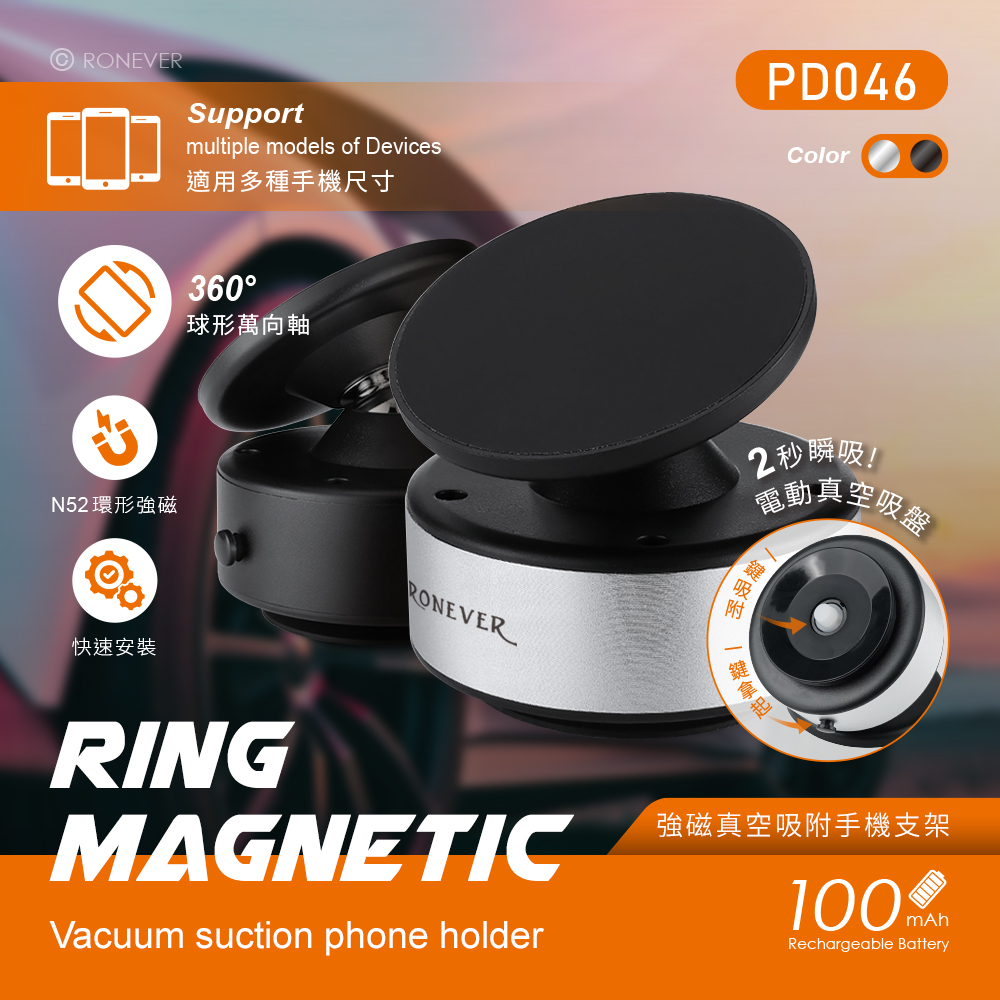 [RONEVER] 強磁真空吸附手機支架 PD046 黑