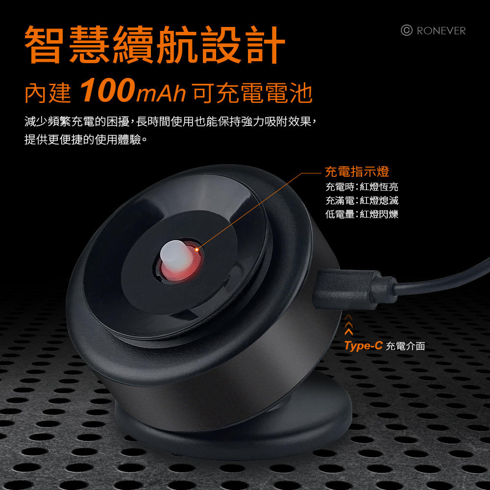 • 電動真空吸盤,光滑平面一鍵吸附,視支架安裝平面材質可雙向吸附。• N52環形排列強磁,精準對位吸附,適用多種機型、MagSafe手機殼。• 堅固鋁合金材質,體積小巧、耐用不占空間。• 球形萬向軸承,可多角度調節,直豎通用。磁鐵規格:N52 (800高斯)額定電壓:DC 5V/0.3A充電時間:約45分鐘電池規格:601220鋰聚合物電池100mAh 磁鐵數量:12顆充電介面:Type-C重量:約100g尺寸:約69x64x58mm材質:ABS塑膠、PC、鋁合金內容物:手機支架、充電線、說明書、引磁片、透明輔助貼片、簡易安裝清潔包