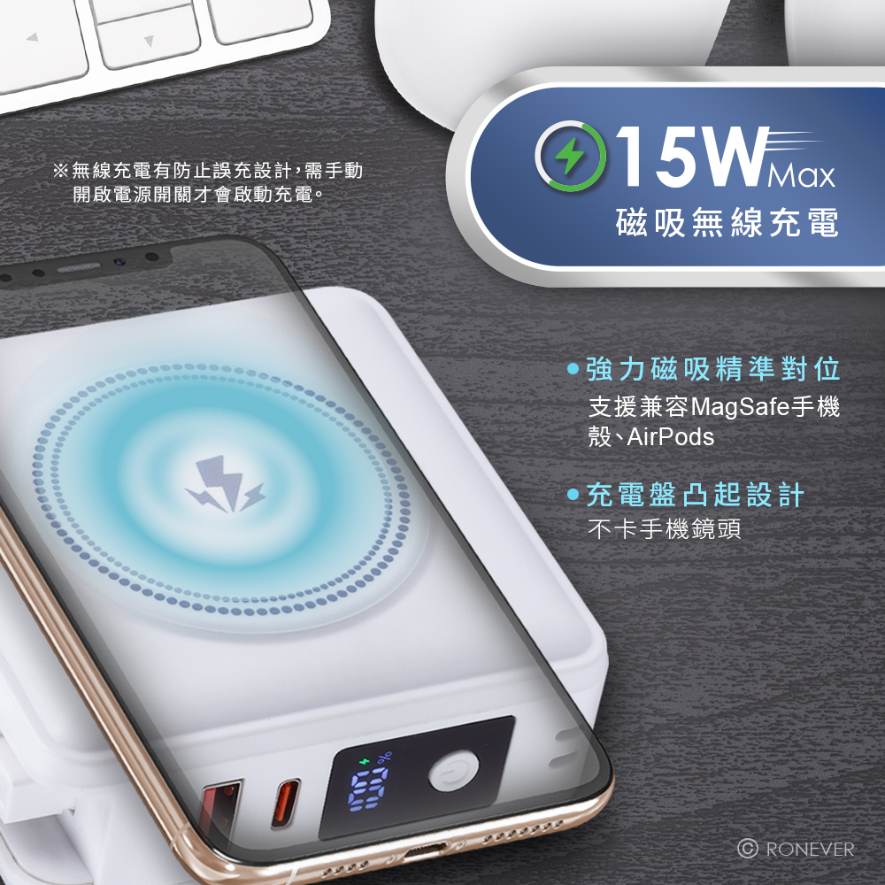 • 兼容多種 Type-C / Lightning 接口設備。• 快充介面設計,最大輸出10W,強力磁吸無線充電,精準對位吸附,最大輸出15W。• 摺疊式AC插頭,可直接插入電源插座,當作充電器使用。• 隱藏式手機支架,可方便邊充邊使用。• 自帶堅韌雙線設計,無需額外攜帶充電線,方便外出旅遊好收納,可帶上機出國。• 電量顯示,輕鬆掌握電源狀態,15000mAh大容量,提供設備滿滿電力。• 附贈專屬配色編織掛繩與金屬扣環,兼具美觀與實用。• 充電盤凸起設計,不卡手機鏡頭,支援兼容MagSafe手機殼、AirPods。額定容量:USB-A:4.5V/10000mAh,USB-A/Type-C/Lightning線/Type-C線:5V/9750mAh, 9V/5250mAh, 12V/3750mAh行動電源模式 : Type-C輸入:5V/2.5A,9V/2.0A,12V/1.5AType-C輸出:5V/3A,9V/2.22A,12V/1.67AUSB-A輸出:5V/4.5A,4.5V/5A,5V/3A,9V/2A,12V/1.5ALightning線輸出:5V/2AType-C線輸出:5V/2A,9V/2A,12V/1.5A無線輸出:5V/5W,7.5V/7.5W,9V/10W,9V/15W(USB-A)+(Type-C)+(Type-C線)+(Lightning線)+無線輸出合計最大輸出:5V/2A+5W,最大總輸出:22.5W充電器模式 : 額定輸入:100-240Vac,50/60Hz,0.4AUSB-A輸出:5V/2.4ALightning線輸出:5V/1.5A Type-C輸出:5V/2.4AType-C線輸出:5V/2A無線輸出:5V/5W 多口輸出模式:(USB-A)+(Type-C)+(Type-C線)+(Lightning線)合計最大輸出5V/2.8A尺寸:約83x83x33mm重量:約326g產品材質:塑膠 / 電子零件電池類型:聚合物鋰電池包裝內容:行動電源x1、掛繩x1、說明書x1