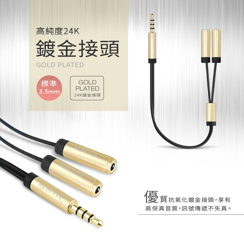 • 高純度3.5mm鍍金接頭,訊號傳輸不失真。• 鋁合金外殼,優質柔軟TPE外被包覆,強韌耐拉扯。• 四極插1公對2母接頭,可音源線分享,支援手機多方通話。• 適用智慧型手機、平板、音響設備...等。• 高傳真立體聲、抗電磁波干擾。接頭規格:4Pole Male to Dual Female接頭材質:3.5mm鍍金接頭外殼材質:鋁合金線長:約25cm重量:9g