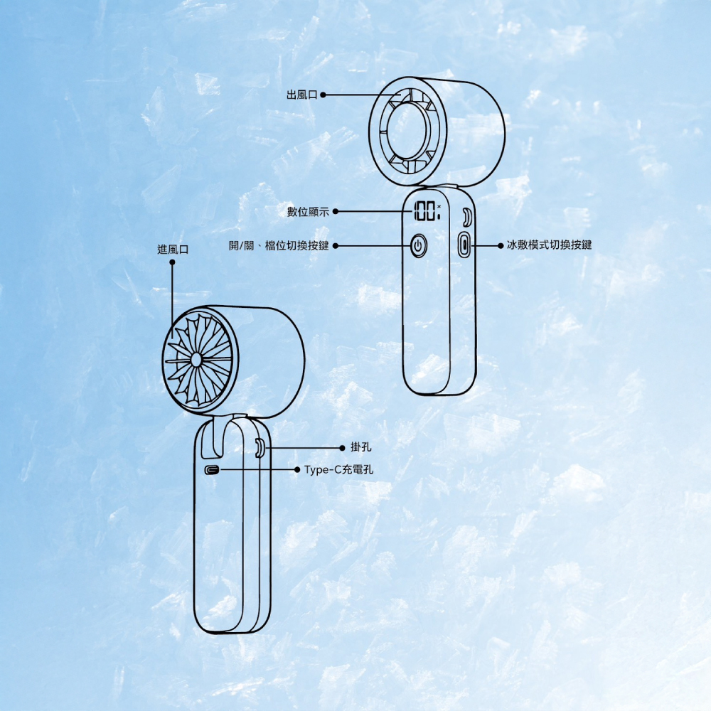 ● 真超導製冷,3秒急速降溫● 小巧時尚,出門必備● 百段風速,隨心掌握● 4000mAh最高續航12小時 產品名稱:RS 冰敷強力風扇產品型號:YF08產品尺寸:54×60×175 mm產品材質:ABS、PC、鋁合金、不鏽鋼、電子元件產品重量:206g±5充電接口:Type-C輸 入:5V⎓2A電池規格:21700鋰電池/4000mAh/3.7V/14.8Wh充電時間:3.5小時工作時間:2.5~12小時(取決於不同檔位/使用場景)產品清單:風扇×1、Type-C充電線、掛繩×1、PE袋、說明書×1◎製冷功能主要設計為貼膚降溫使用,建議將冷卻面輕貼於手腕、額頭或頸部等肌膚部位。◎請注意,在戶外高溫環境中直接吹風,無法產生冷風效果,屬正常現象,並非產品異常。