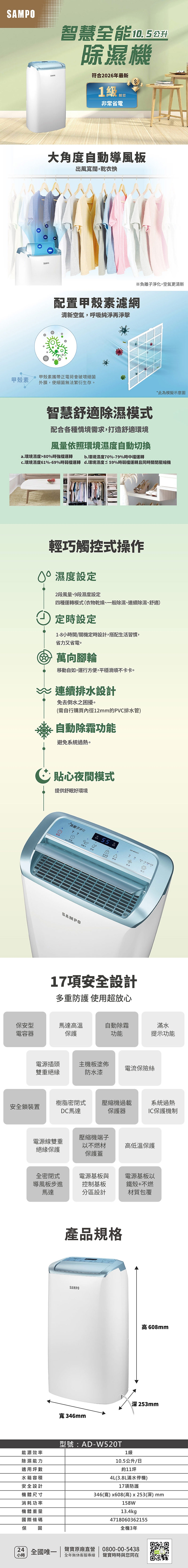 聲寶 AD-W520T 10.5L負離子智慧除濕機