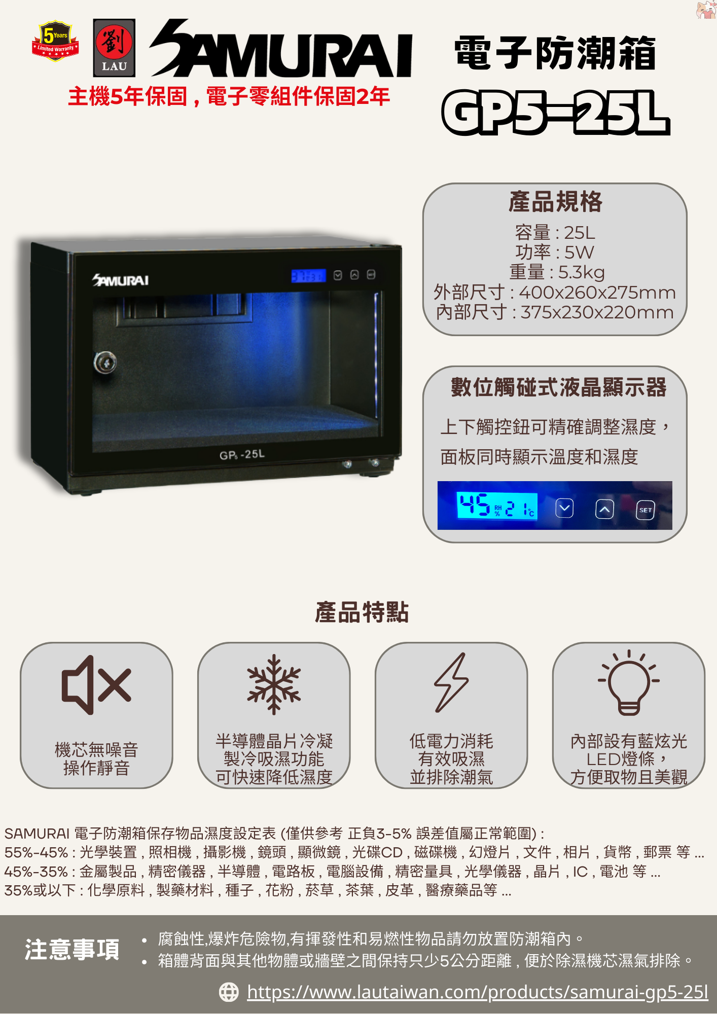 SAMURAI GP5-25L 觸碰式設定液晶顯示器電子防潮箱 特點 :