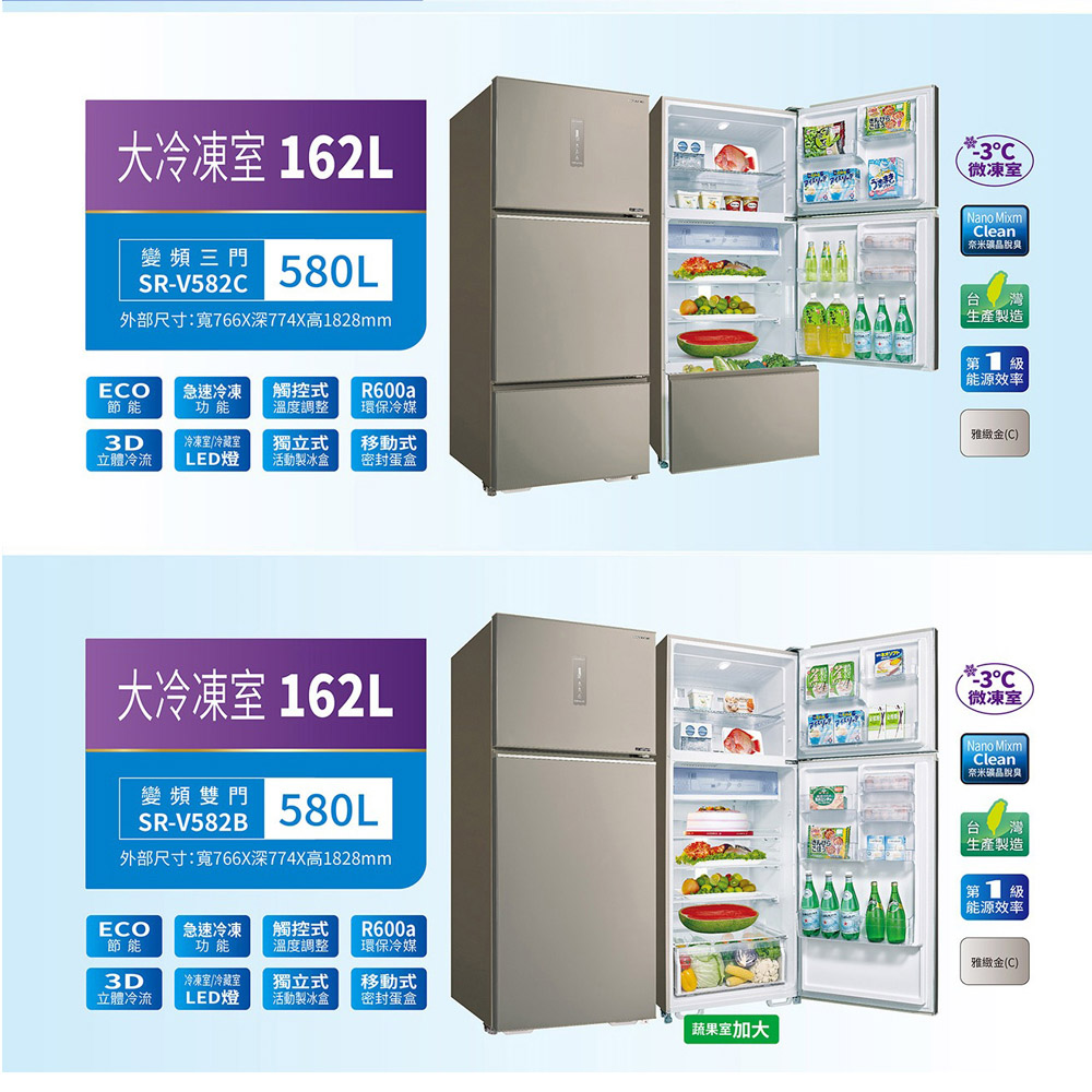SANLUX台灣三洋 580公升一級變頻雙門電冰箱 SR-V582B