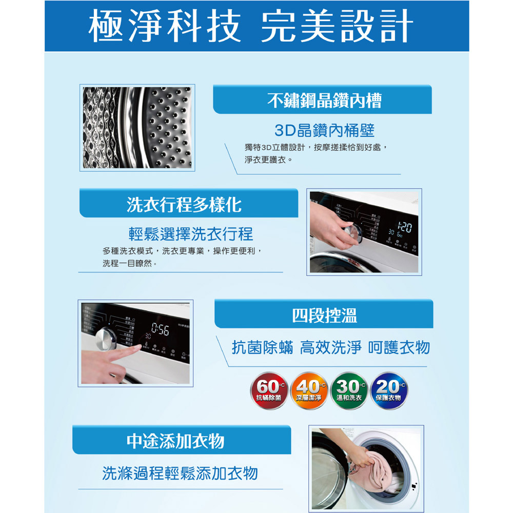 洗衣行程選擇:標準、污髒、快速、記憶、柔洗、護嬰、槽洗淨、棉麻、單脫水化纖、混合、單乾衣、快速洗乾、洗清脫水