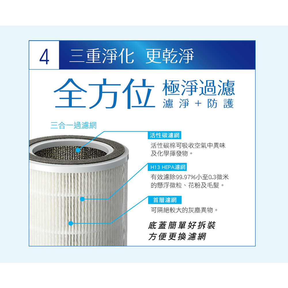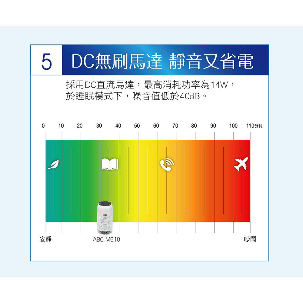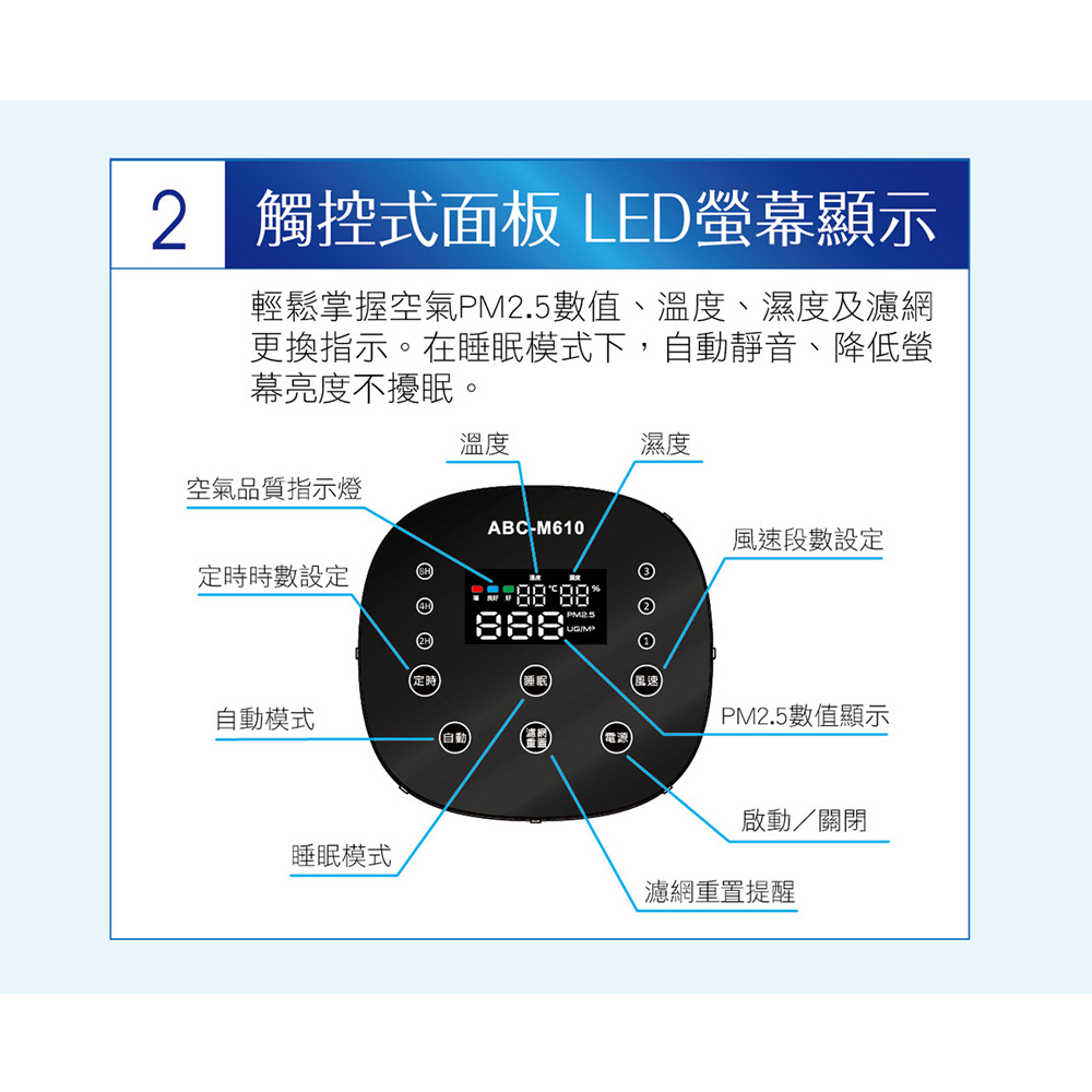 ■ 商品送達後若因買家因素無法安裝或拒收,買家需負擔賣家出貨產生的物流費用商品特色:PM2.5數據顯示空氣品質看的見觸控式背光控制面板3段LED空氣品質顯示燈號DC無刷馬達靜音又省電(14w)定時關機2/4/8小時3段風速+智慧偵測自動模式睡眠模式:靜音、螢幕亮度下降不擾眠三合一濾網:首層濾網隔絕灰塵異物+H13級HEPA過濾網+活性碳濾網每4380小時貼心濾網更新提醒底蓋簡單好拆裝,方便更換濾網商品規格:型號:ABC-M610濾網種類:HEPA濾網, 活性碳濾網產地:中國CADR值99.1cfm(160m3/h)機身尺寸(寬x高x深)(mm):W220*D210*H410mm電源:110V/60Hz機體重量:約2.3kg適用坪數:3-6坪適用濾網:三合一濾網:首層濾網隔絕灰塵異物+H13級HEPA過濾網+活性碳濾網消耗電功率:14W保固:1年BSMI:R41010本商品資訊由網路及官網收集彙整而成,僅供參考,如有更新或異動不另外通知,正確商品資訊及規格以實機為準。鑑賞期非試用期,產品一經使用皆會影響您退貨權利。