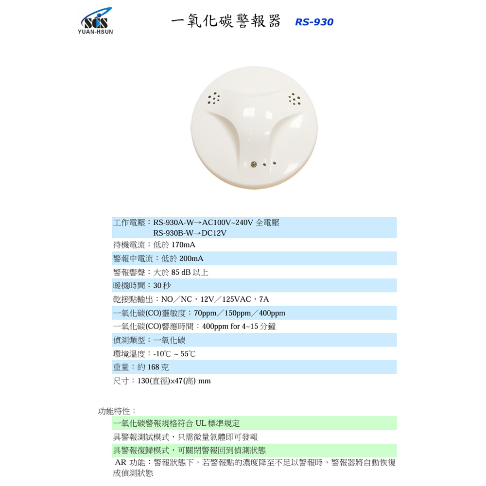 昌運監視器 SCS RS-930A-W AC100V~240V 瓦斯警報器 一氧化碳警報器