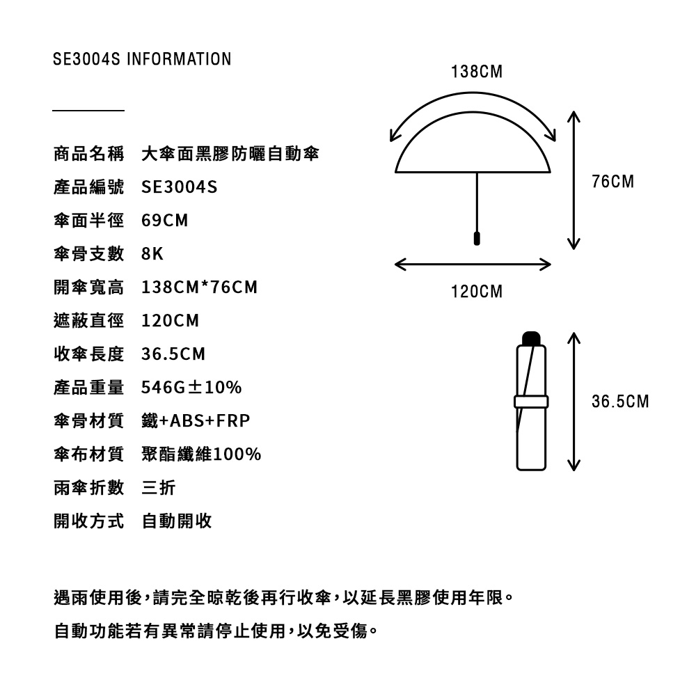 ★直徑120cm大傘面_可雙人同時使用★★黑膠防曬圖層_達到傘下降溫效果★★抗紫外線★★強化樹脂ABS傘骨_抗風力提升★★圓柱型手柄設計_舒適兼具時尚★★一鍵自動開收功能★