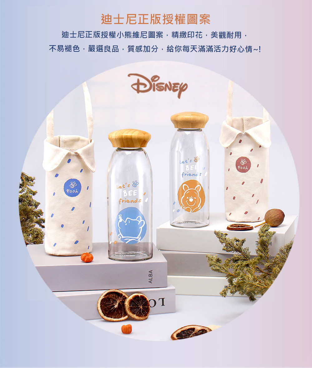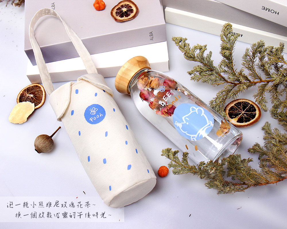 Disney迪士尼 維尼日和 竹蓋小玻璃瓶提袋組500ml